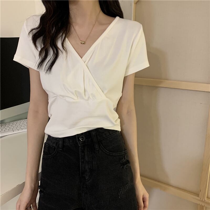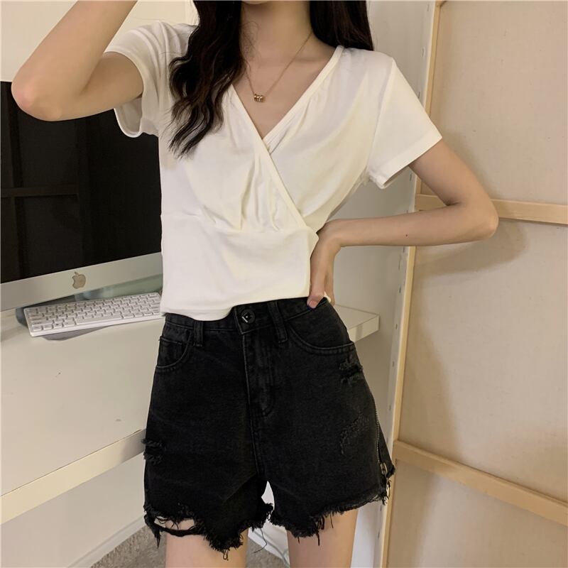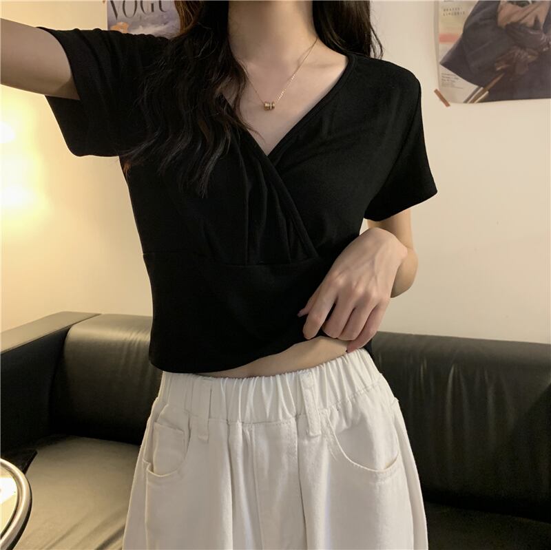 ブラックVネックショート夏服クロップドTシャツトップス 夏物 ウエスト コーデ Marchs75494489509