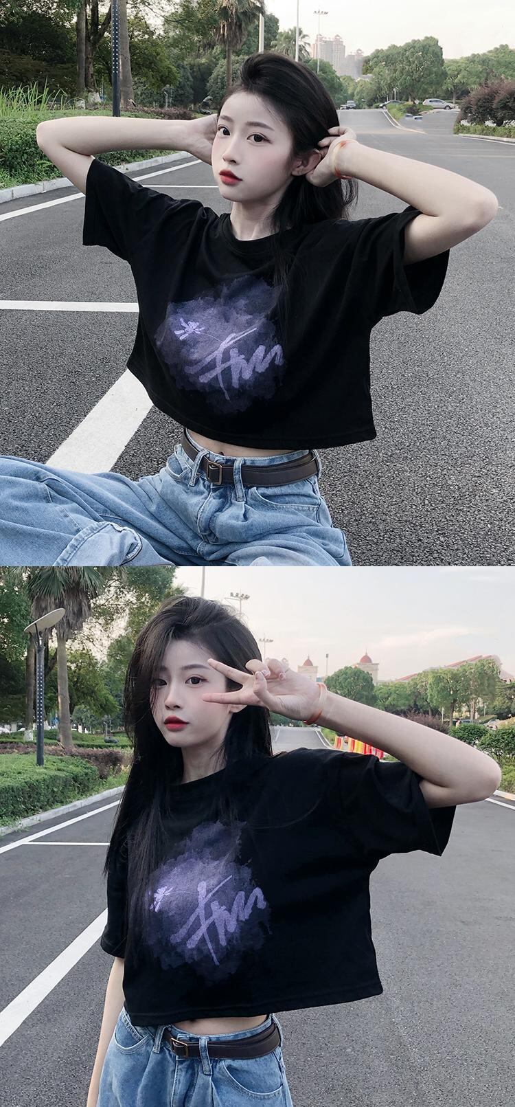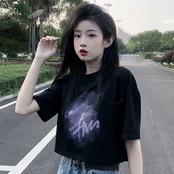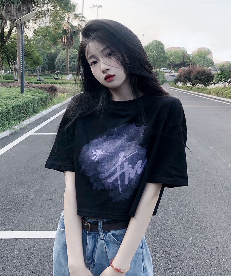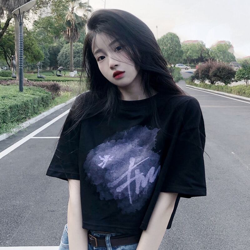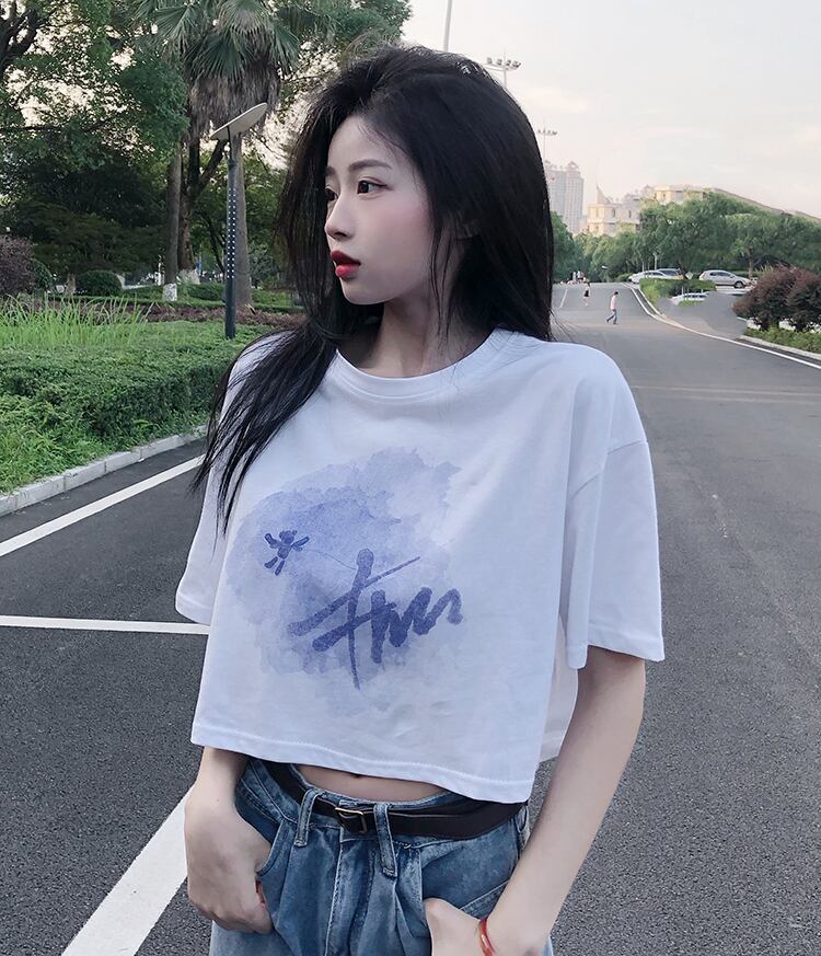 ホワイトショートTシャツ夏服プリントルーズハイウェストウェストクロップトップ トップス 夏物 ウエスト コーデ Marchs731366060
