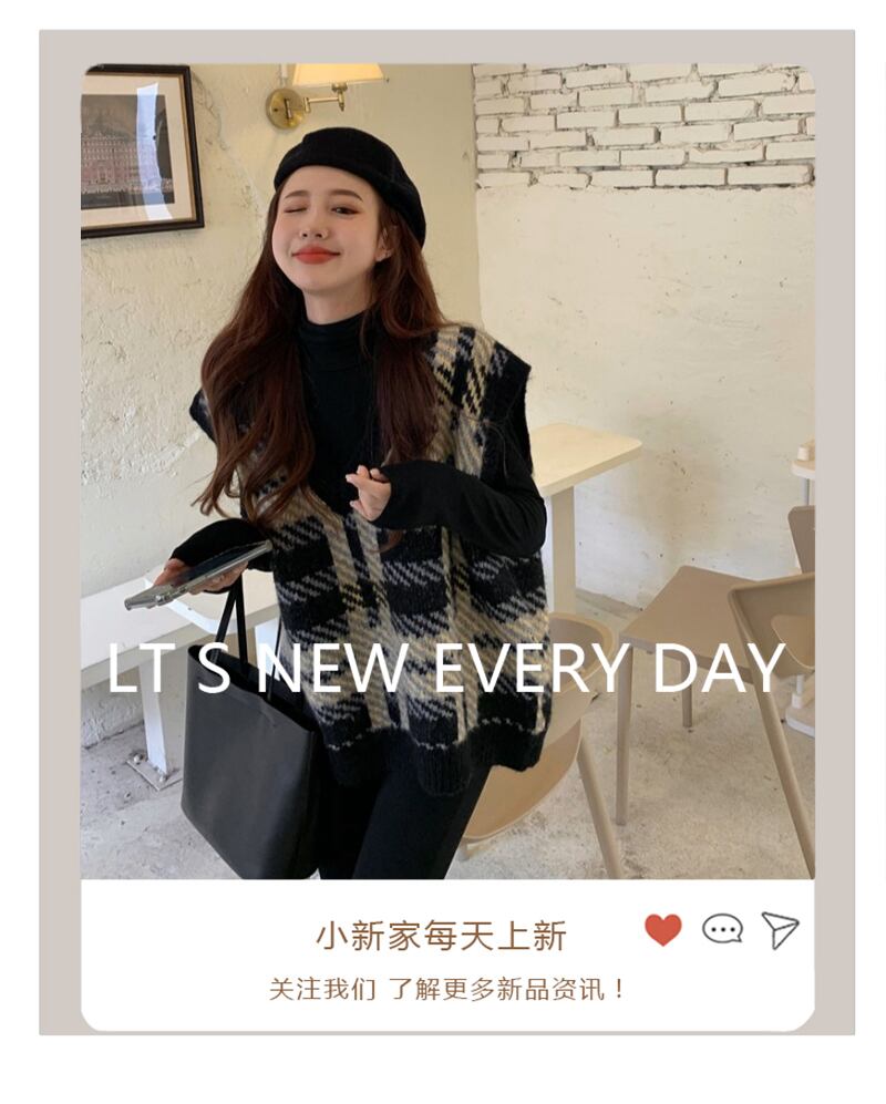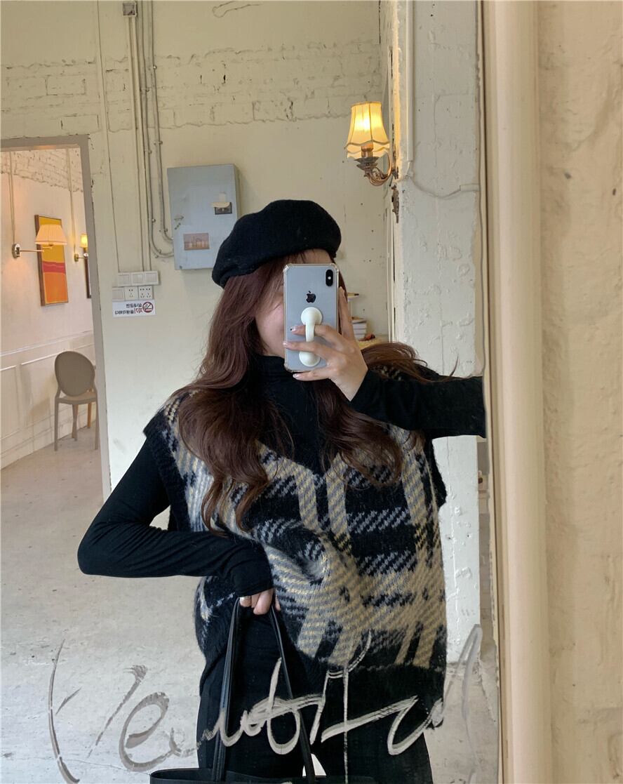 Vネックスタンダードブラックホワイト格子柄ニットスプリング秋物ルーズゆったりセーター NEW レトロ 春物 オータム コーデ Marchs26575469542