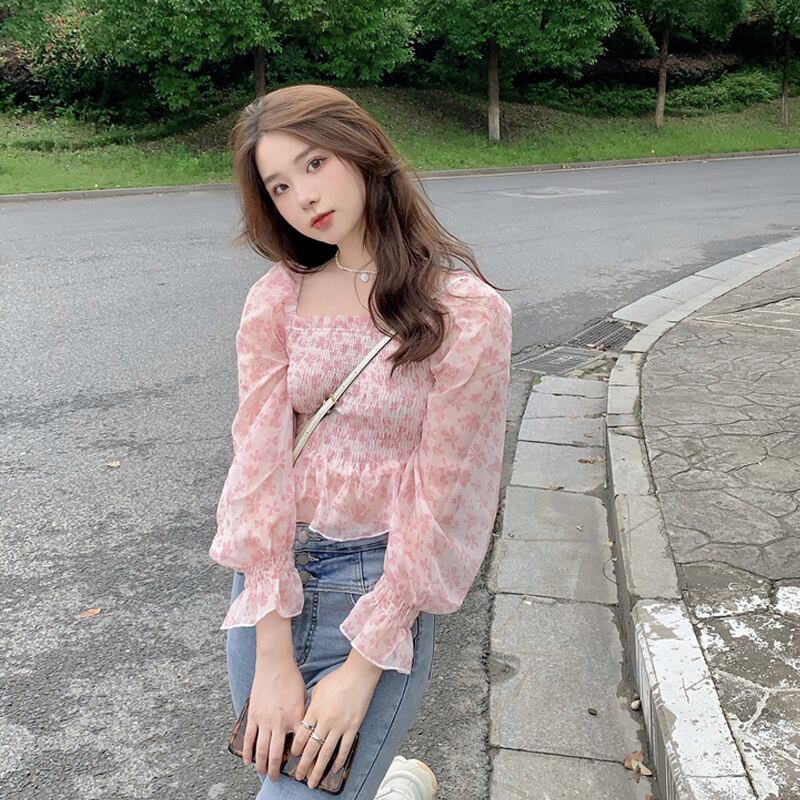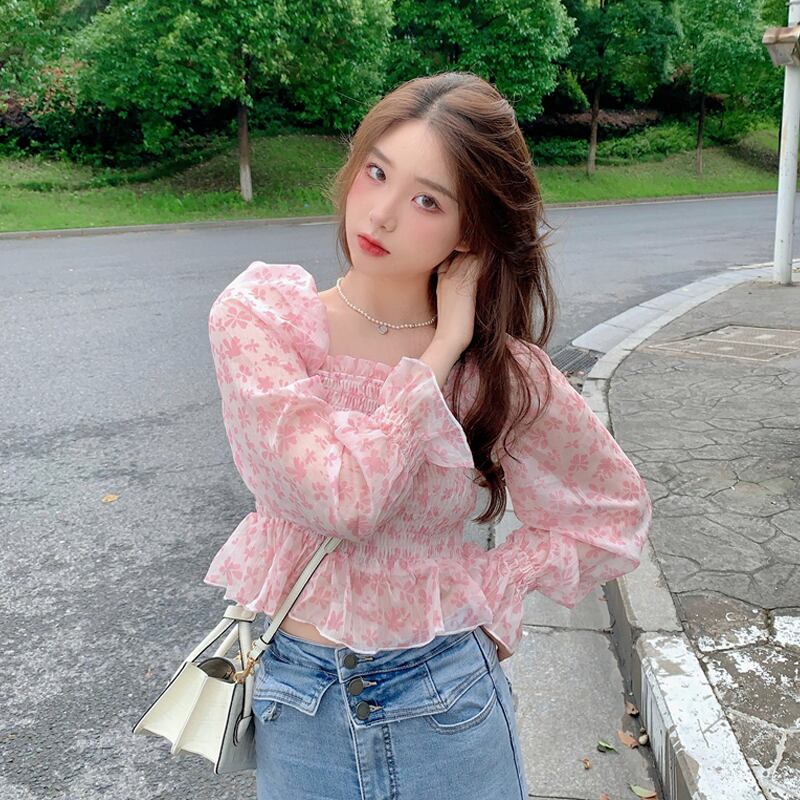 ウェストショートトップス スプリングカラーフローラルシフォンシャツ 大人ガーリー スウィート キュート カジュアル 春物 花柄 スクウェア ウエスト コーデ Marchs51756225679