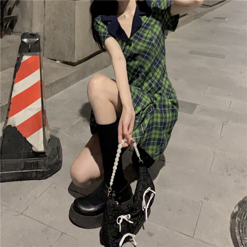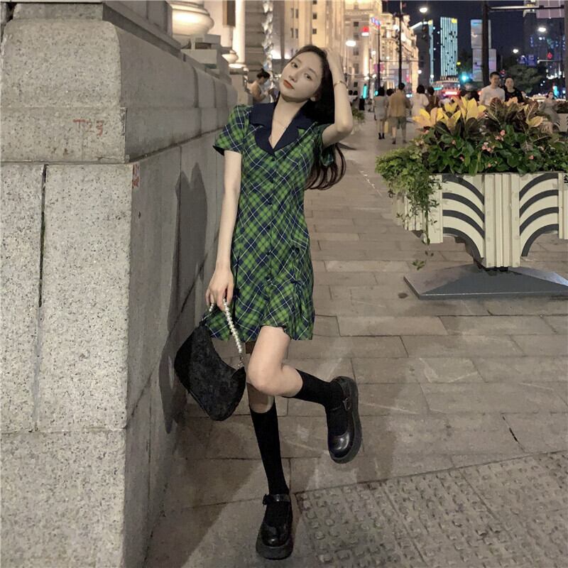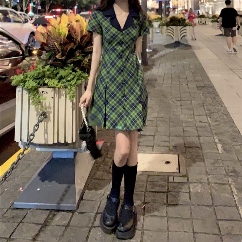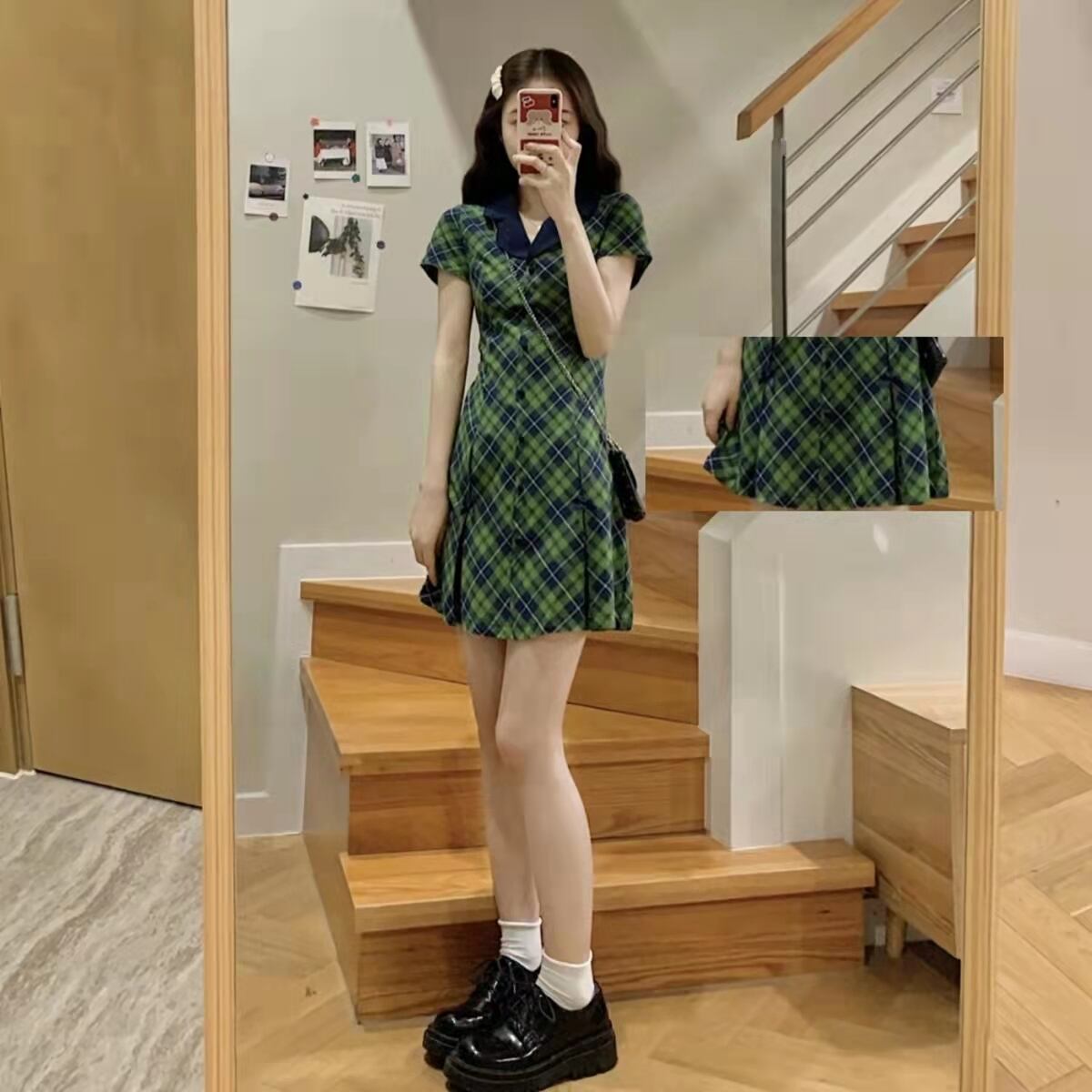 グリーン格子柄ワンピースレディースリボンVネックウェストスカート スタイル夏服 大人ガーリー スウィート キュート カジュアル 夏物 ウエスト コーデ Marchs58247745754