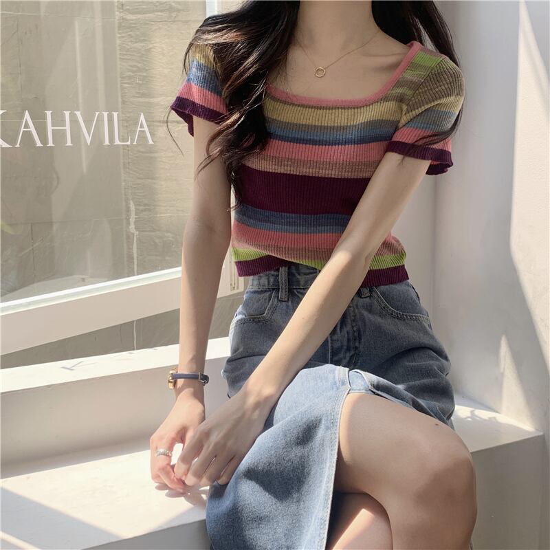 ストライプニットNEW夏服薄手カラートップス 大人ガーリー スウィート キュート カジュアル 夏物 シルク スクウェア コーデ Marchs64083815612