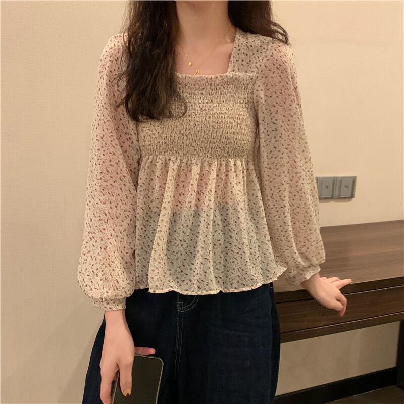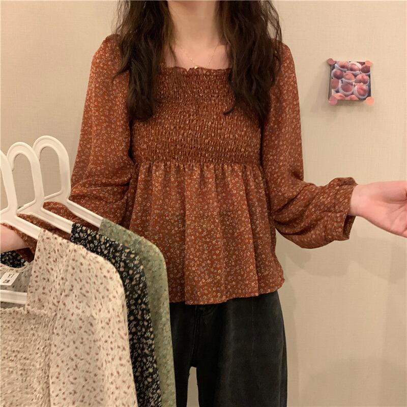 スタンダードスタイルフローラルシフォンシャツ レディース夏服ウェストカラーショートトップス レトロ 夏物 花柄 スクウェア ウエスト コーデ Marchs92164311436