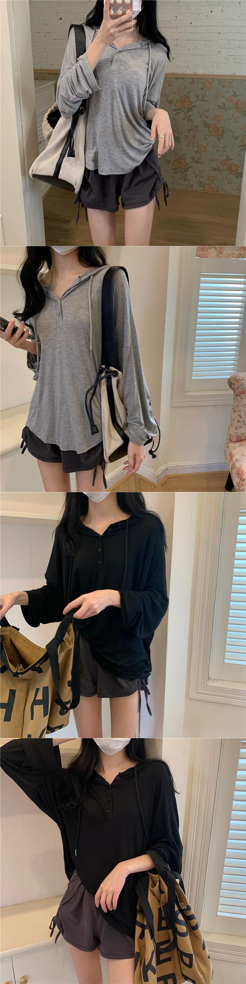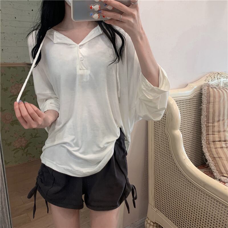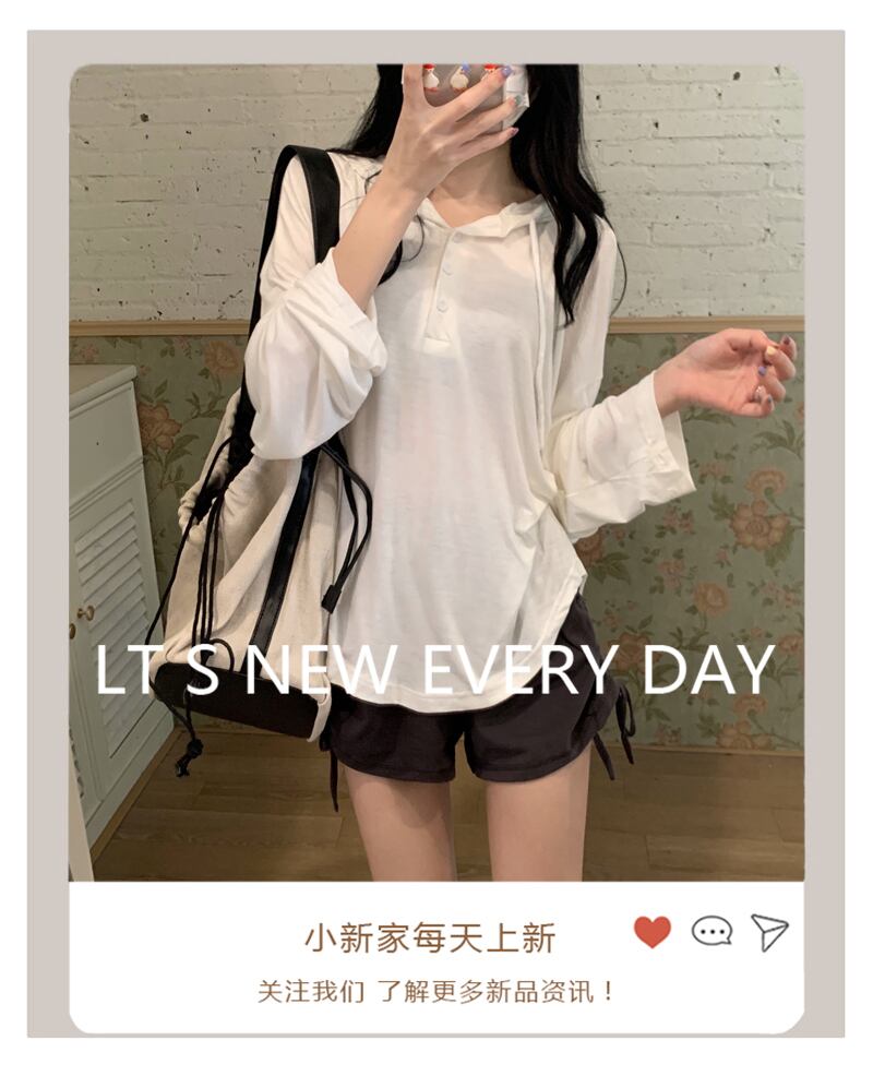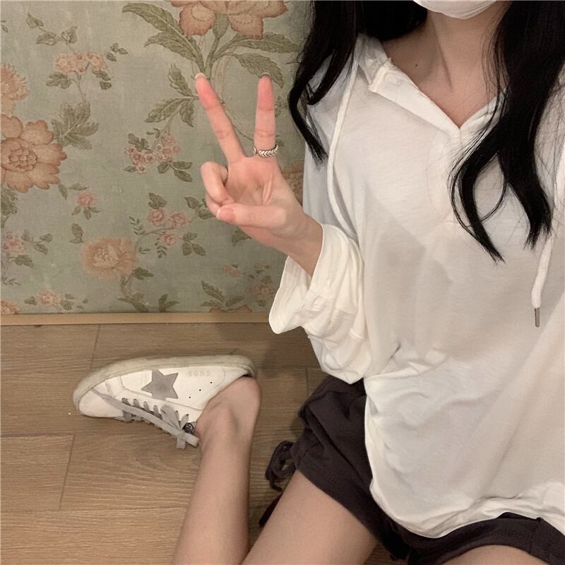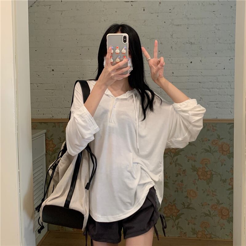 ホワイトTシャツ夏服薄手セーター 韓国ファッションルーズフードカラートップス ロング 夏物 シルク スタイル 長袖 コーデ Marchs53209701428