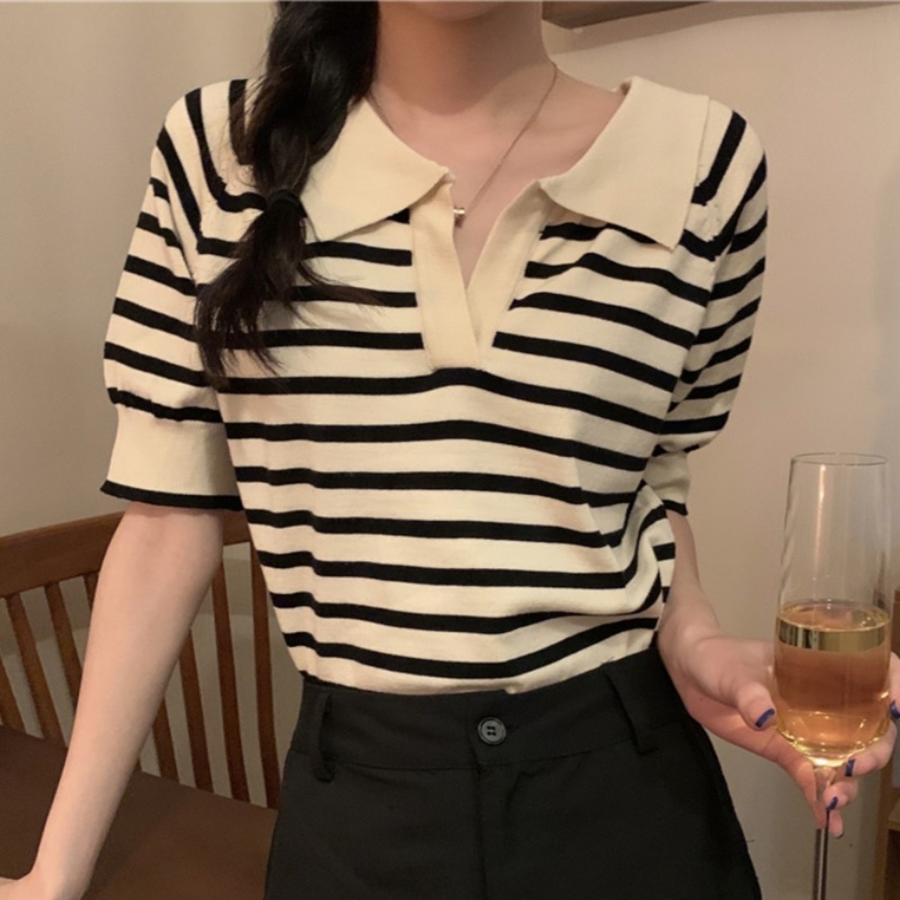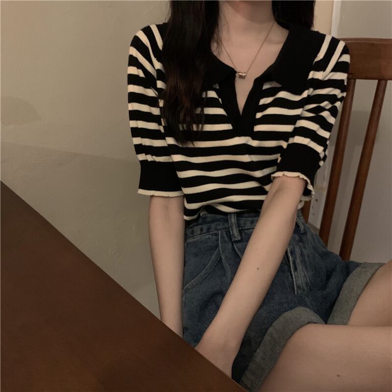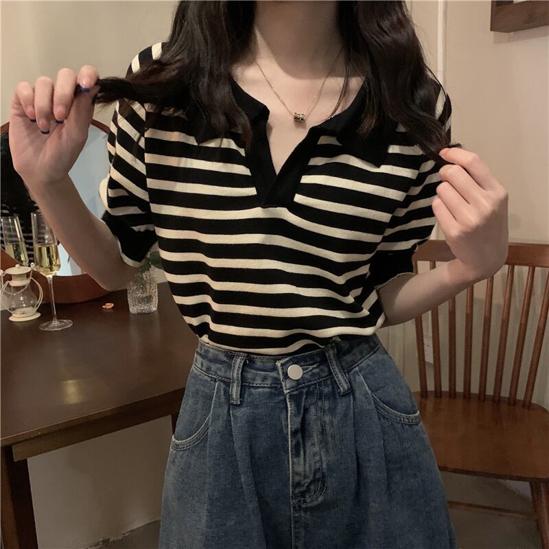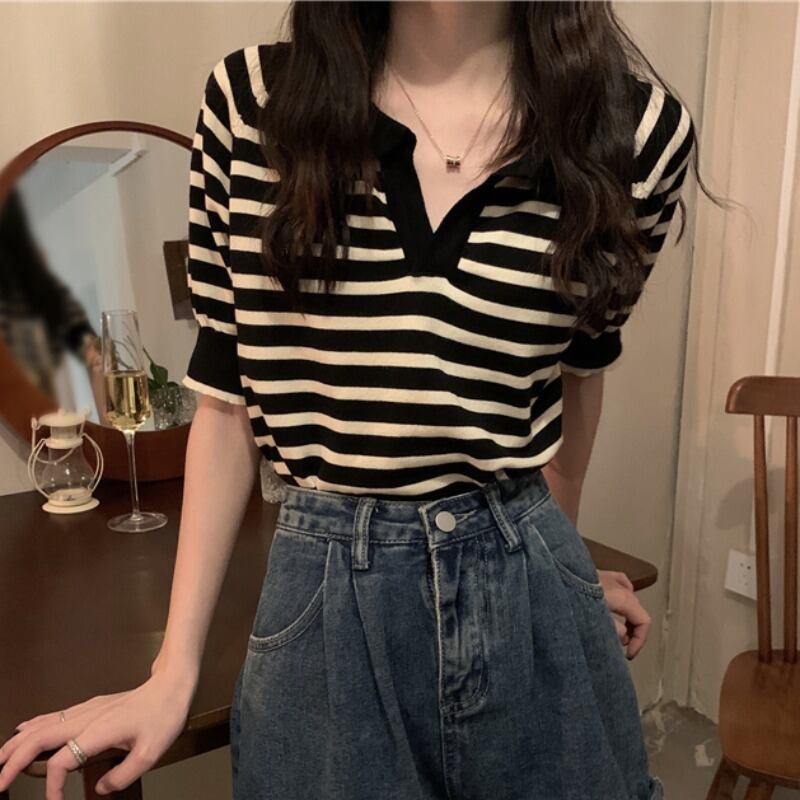 Tシャツシャツ NEW夏服Vネックストライプトップス 夏物 コーデ Marchs65764630589