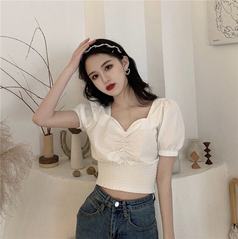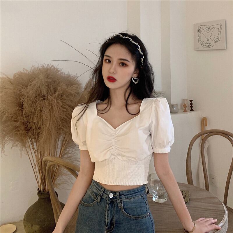 ホワイトトップス 夏服ショートウェストシャツ プリーツ 夏物 スクウェア パフスリーブ ウエスト コーデ Marchs58122827446