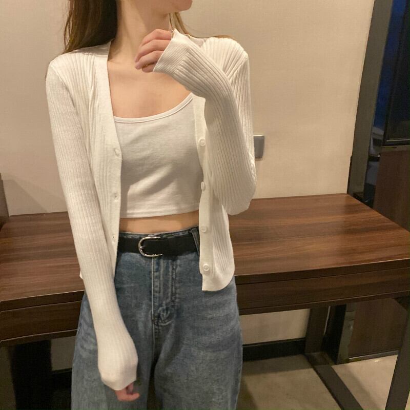 ホワイトVネック薄手ニットカーディガンゆったりトップス ジャケット ロング 長袖 コーデ Marchs53596559261