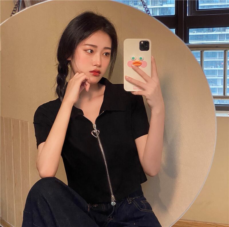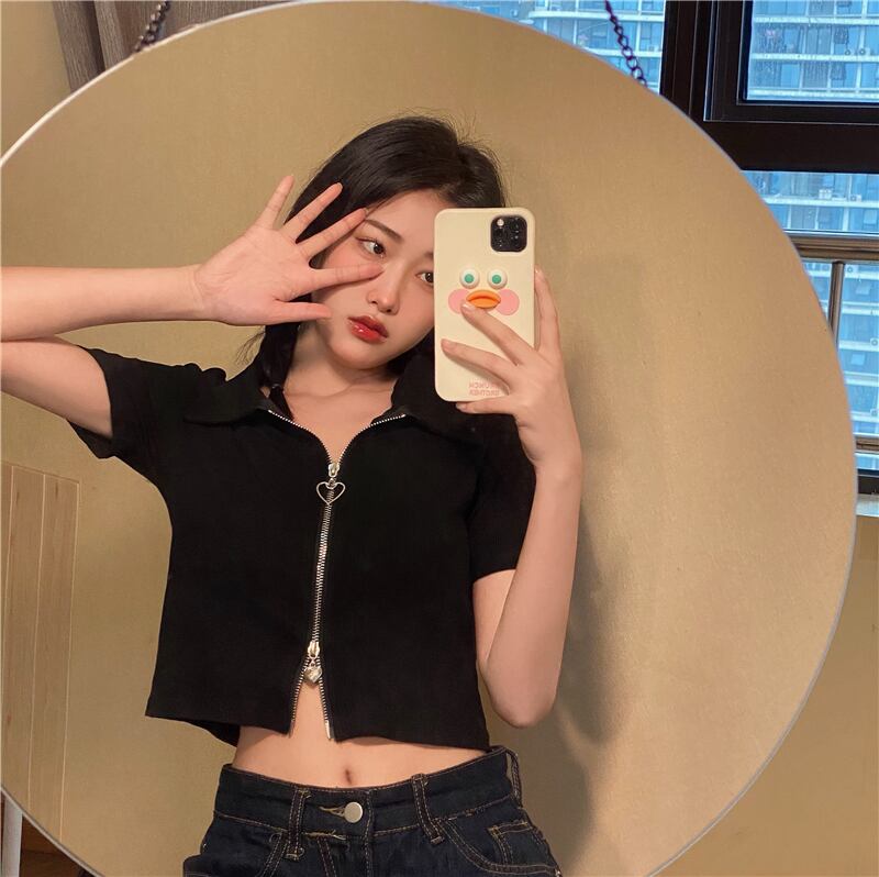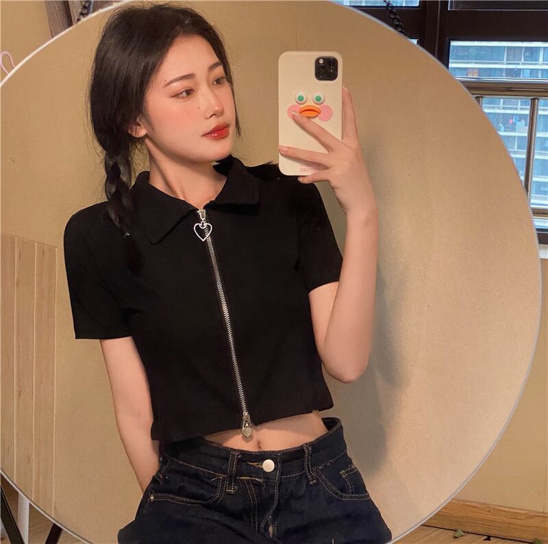 ブラックカラーショートTシャツ夏服ジッパーハイウェストウェストクロップドトップス 夏物 ウエスト コーデ Marchs31932625780