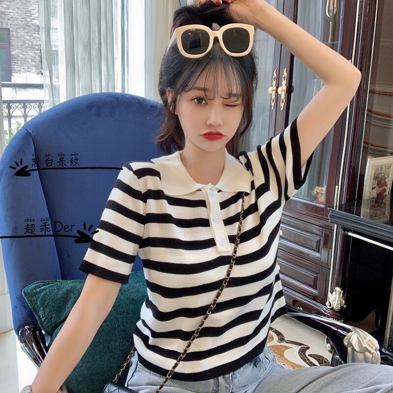 カラーストライプショートTシャツ夏服ハイウェストトップス ニットセーター 夏物 ウエスト コーデ Marchs99394764745