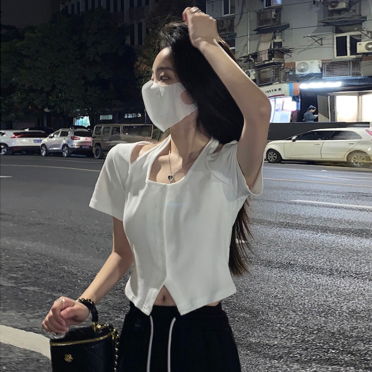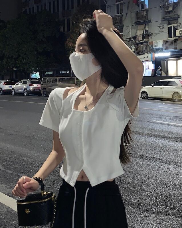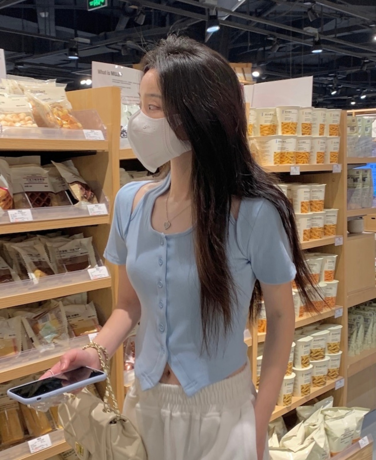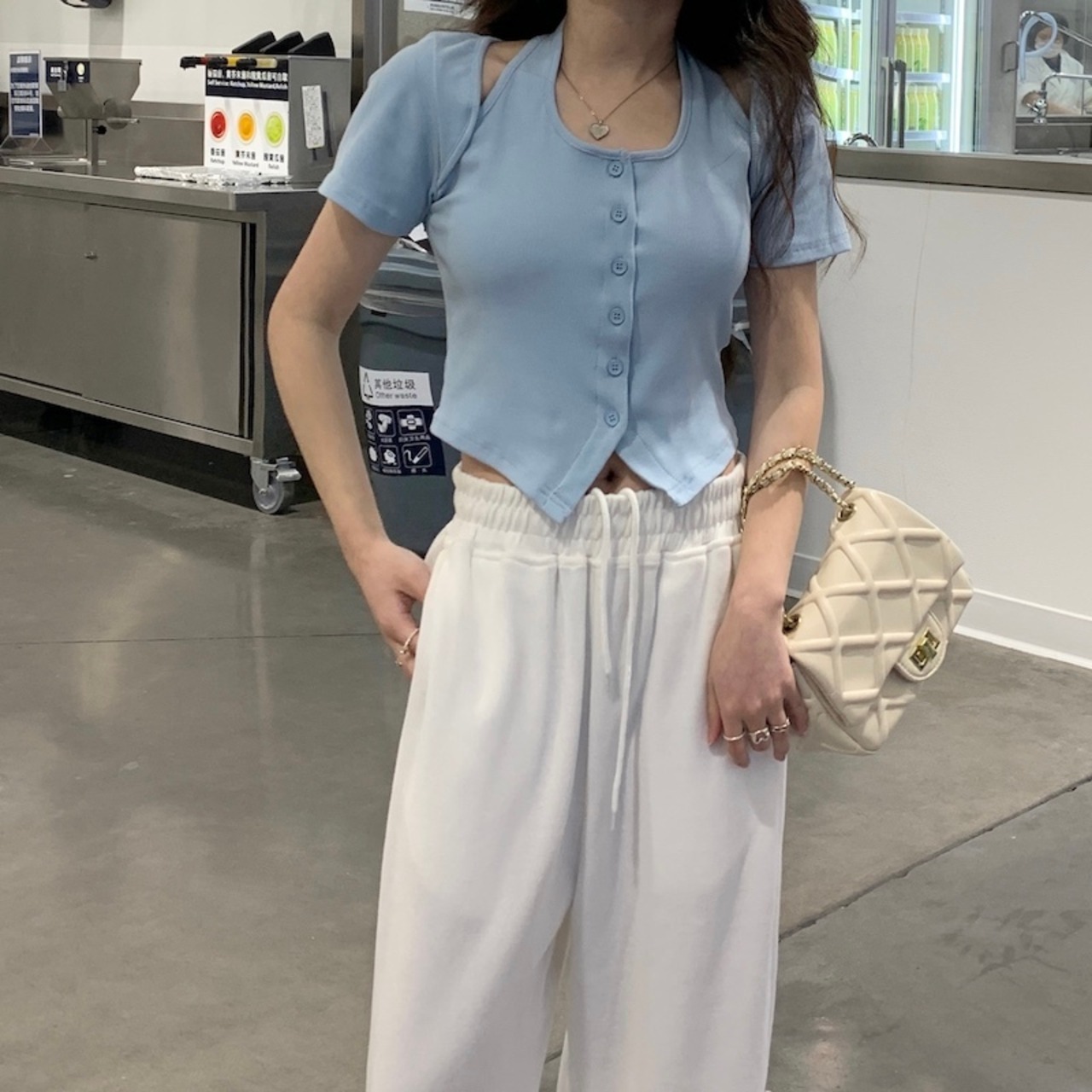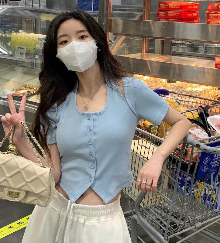 ショートトップス 夏服ハートスリムブルー半袖スリーブTシャツ ハーフスリーブ 大人ガーリー スウィート キュート カジュアル 夏物 コーデ Marchs81860562523