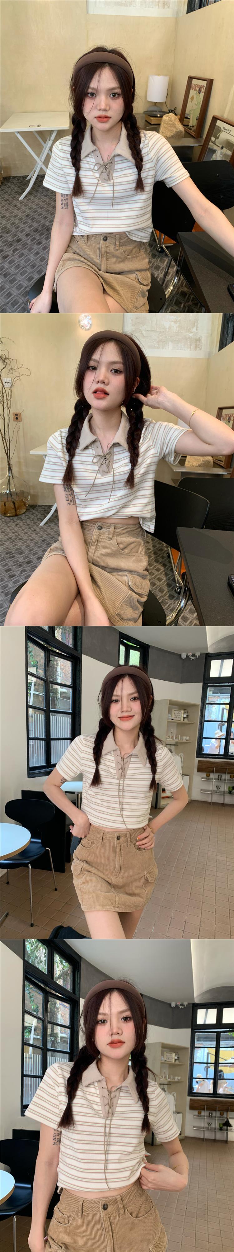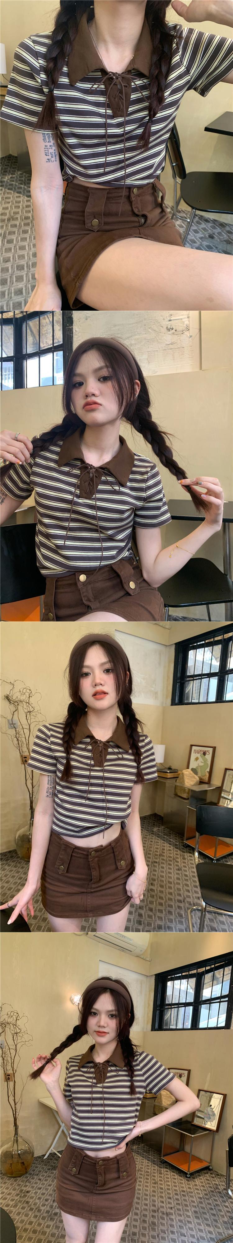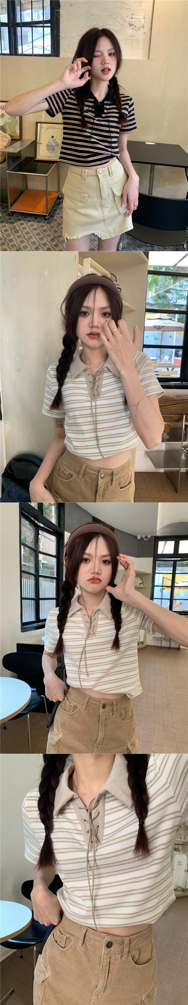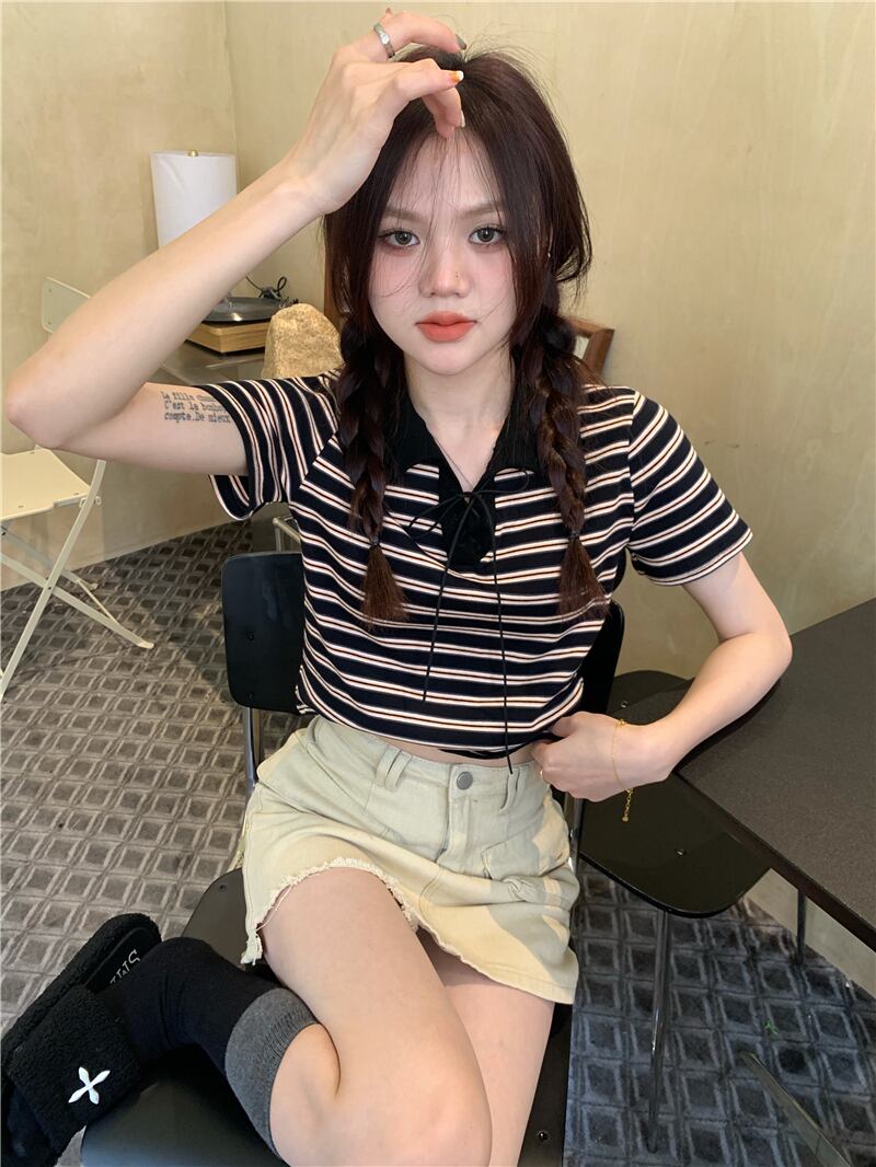 カラーストライプTシャツショート夏服スリムハイウェストウェストクロップドスタイルトップス 大人ガーリー スウィート キュート カジュアル 夏物 ウエスト コーデ Marchs63818061173