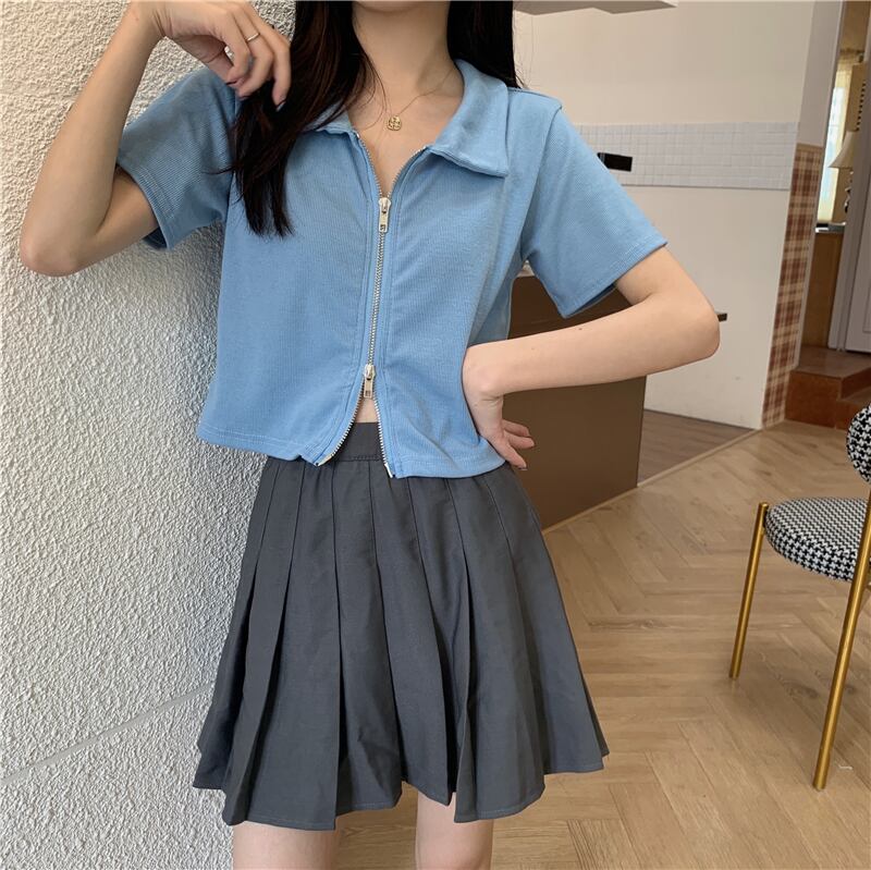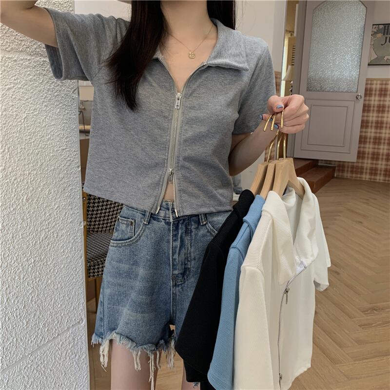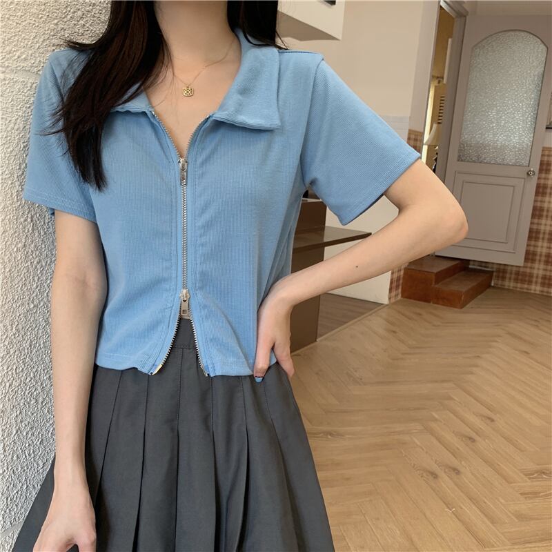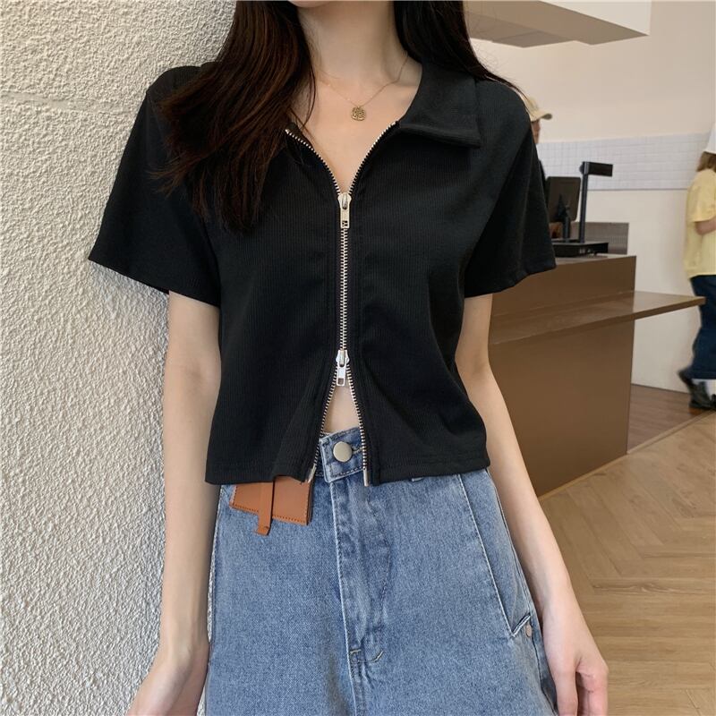 カラー半袖スリーブ夏服ダブルジッパークロップドトップス ブラックTシャツ ショート ハーフスリーブ 夏物 コーデ Marchs18411070416