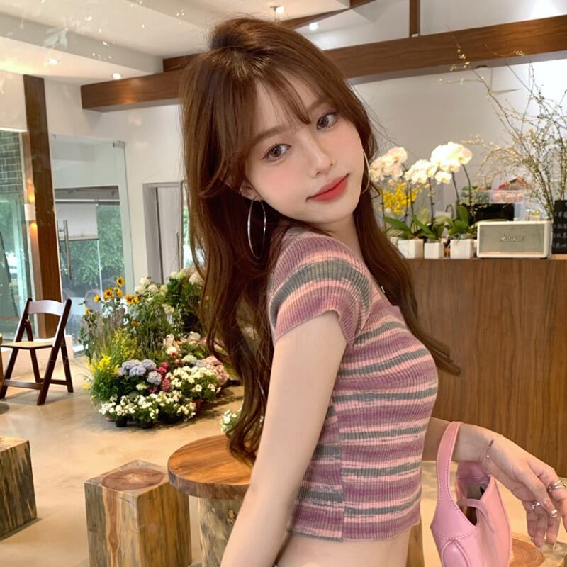 ストライプニットショートTシャツ夏服スタイルスリムクロップトップ トップス ハイウェストウェストパンツ 大人ガーリー スウィート キュート カジュアル 夏物 ウエスト コーデ Marchs76176139355