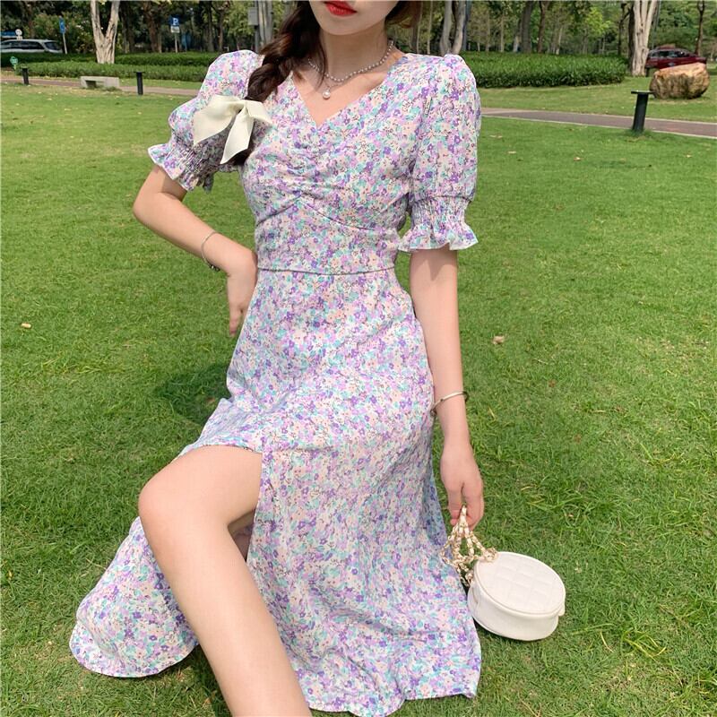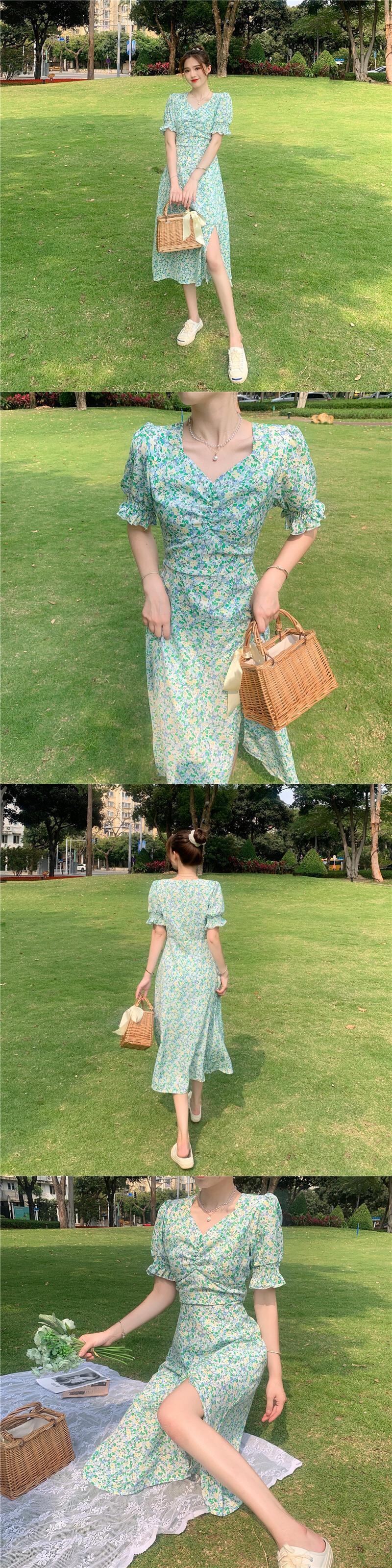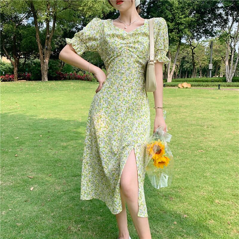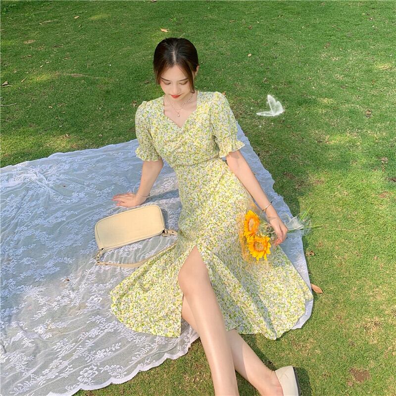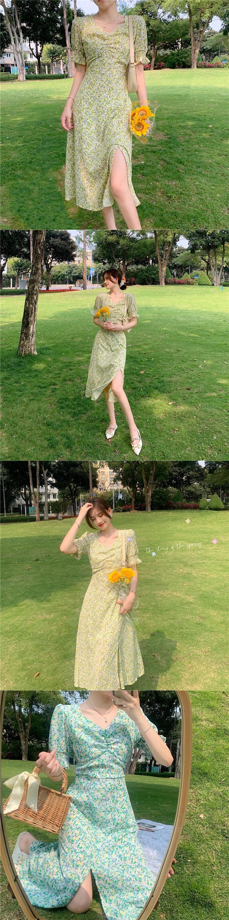 イエローフローラルスカート ロングスタイルスリーブワンピース夏服 夏物 花柄 フラワーデザイン コーデ Marchs89387859320