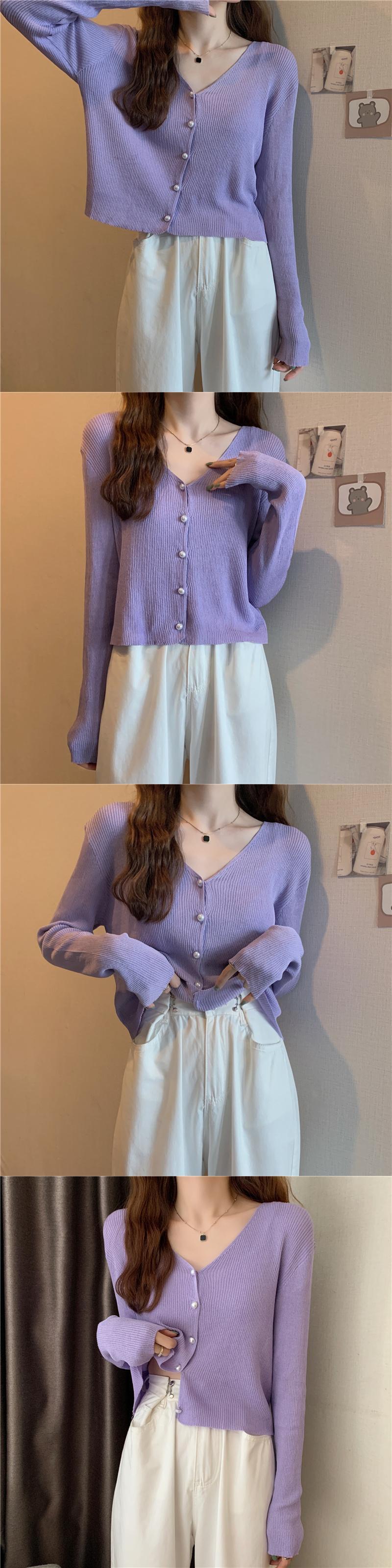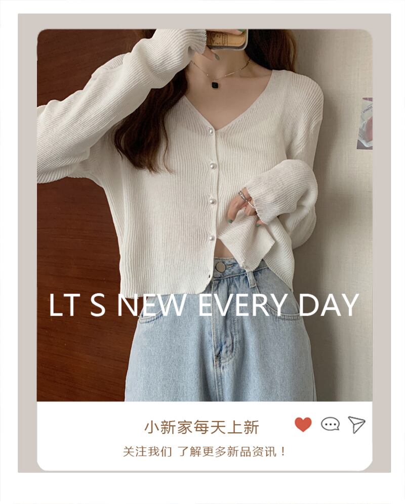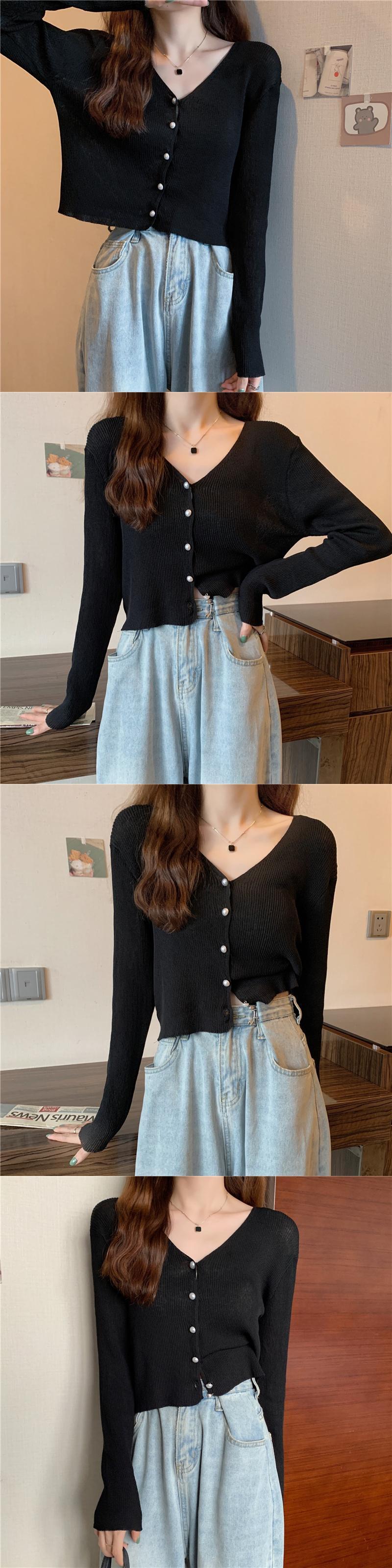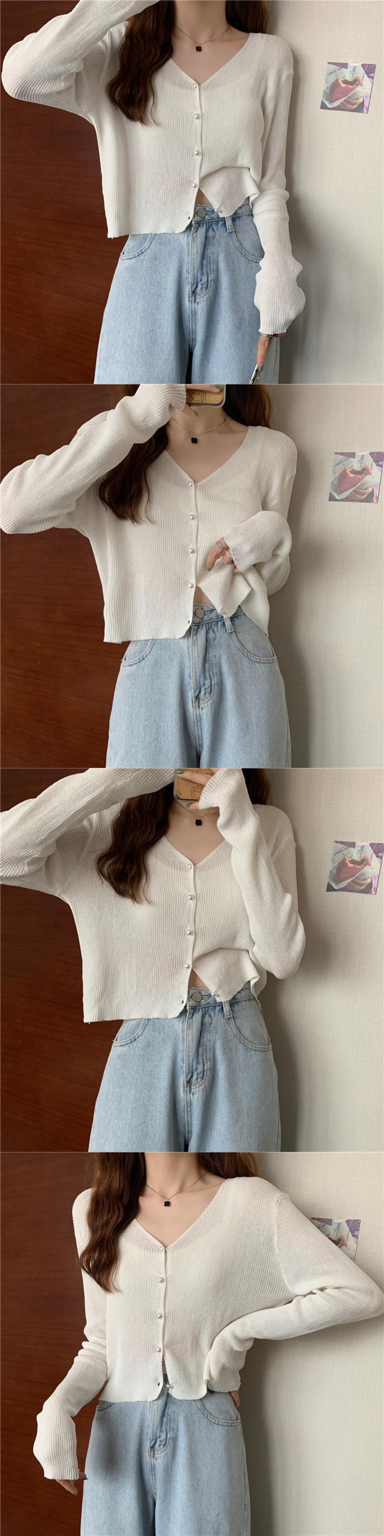 ホワイトニットカーディガン夏服Vネックショートシャツ パール薄手ハイウェストトップス 夏物 真珠 ウエスト コーデ Marchs69771058867