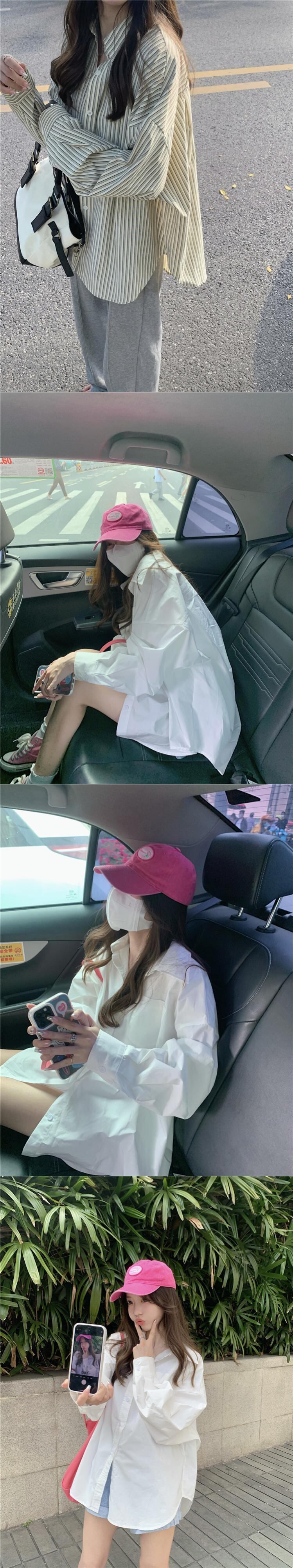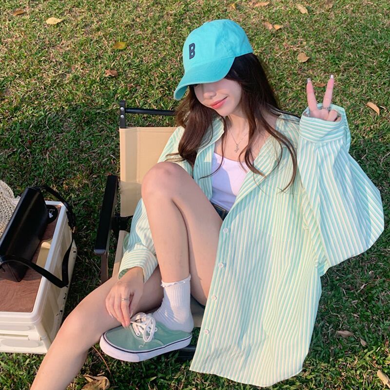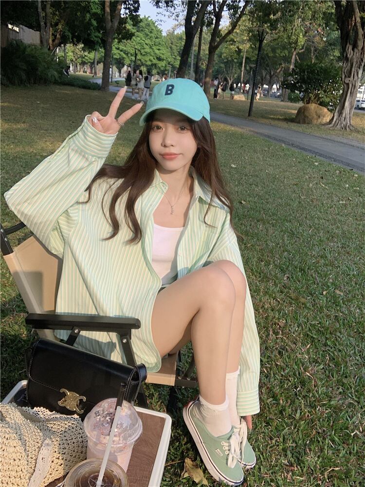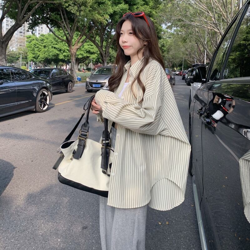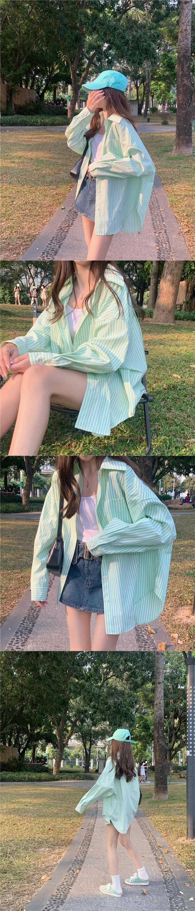 オーバーサイズグリーンストライプシャツ スプリング夏服ルーズカジュアルジャケット ロング 春物 夏物 ボーイズ 長袖 コーデ Marchs5495634170