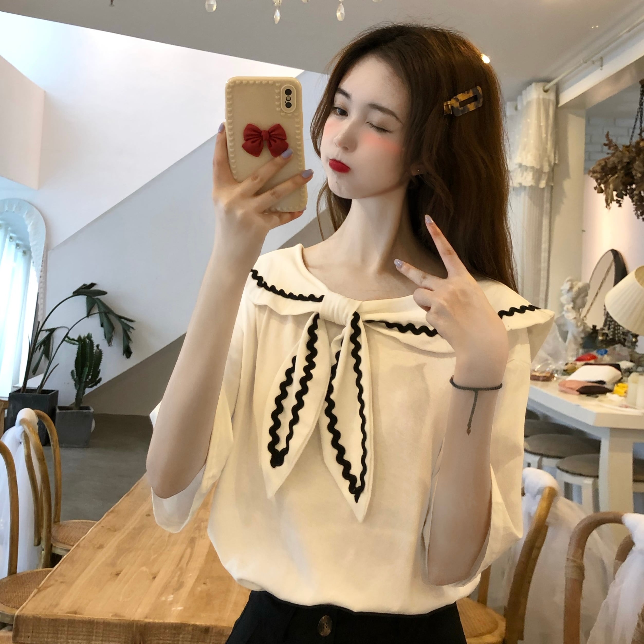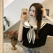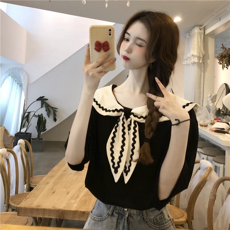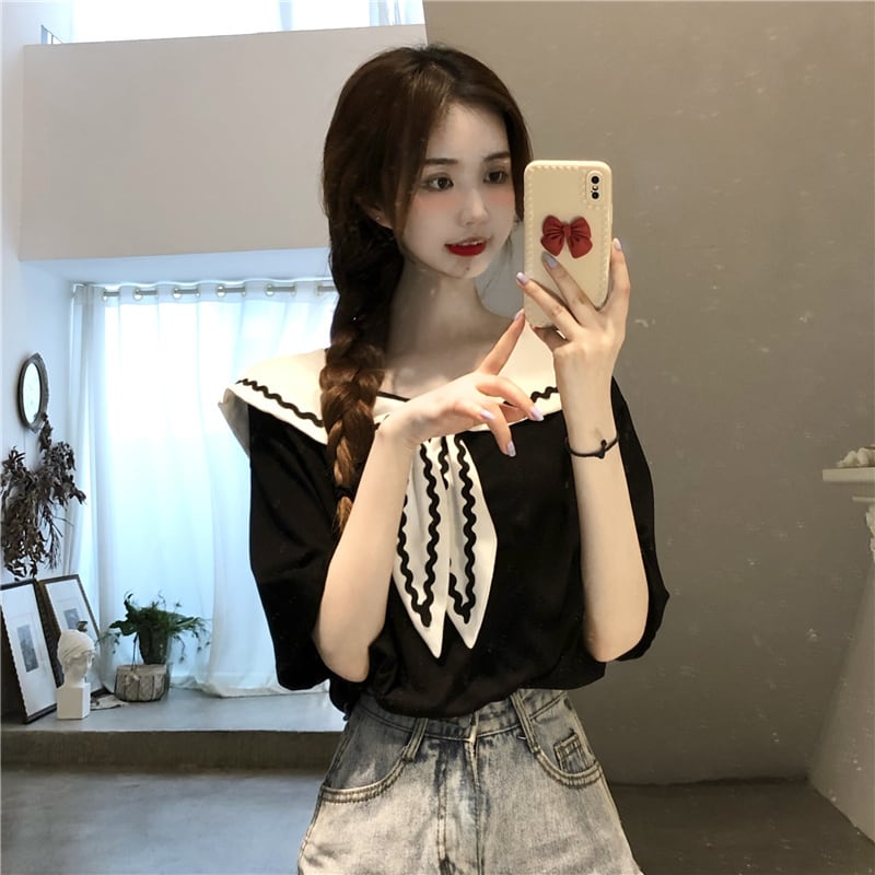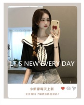 スタイルネイビーカラーブラックTシャツ夏服スタンダードルーズトップス レトロ 夏物 コーデ Marchs18325305425