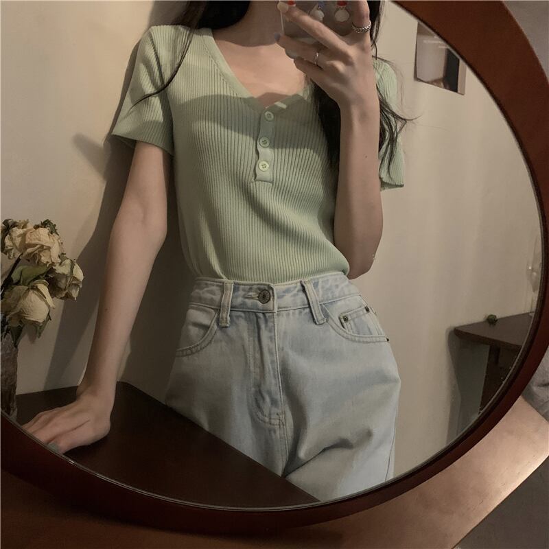 夏服スリムフィットVネックTシャツ韓国ファッションスタイル薄手ニットセーター トップス 夏物 シルク コーデ Marchs92014641297