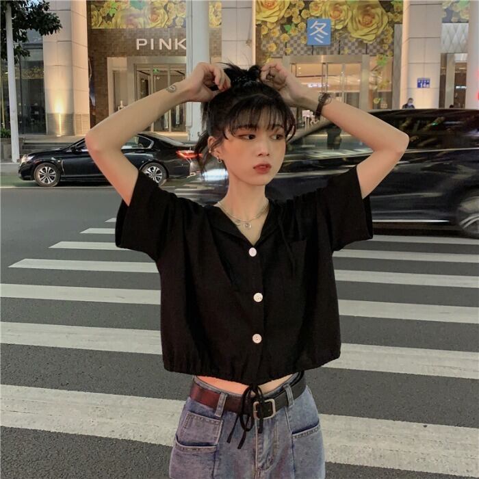 ギャザーフードショートカーディガンTシャツ韓国ファッションルーズ夏服ハイウェストウェストカジュアルトップス 夏物 スタイル ウエスト コーデ Marchs58172324789
