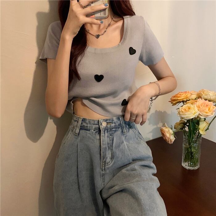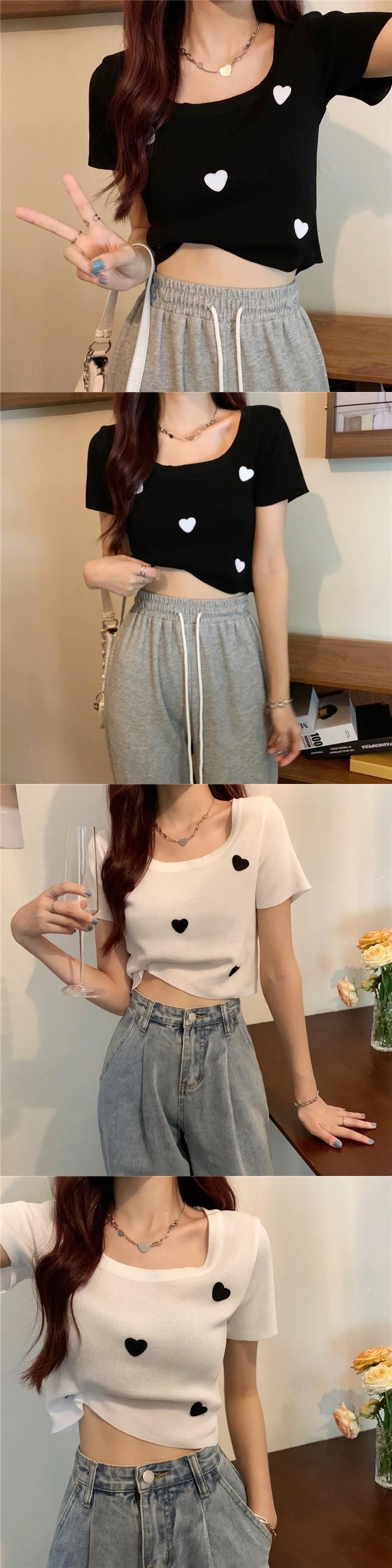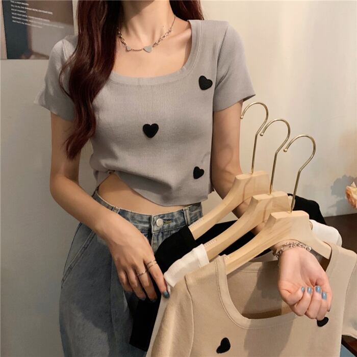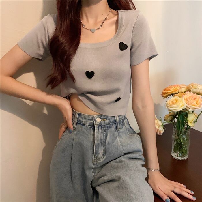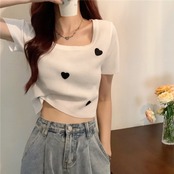 スタイルニットハート刺繍ホワイトTシャツ夏服クロップドトップス 大人ガーリー スウィート キュート カジュアル 夏物 スクウェア コーデ Marchs6286332812