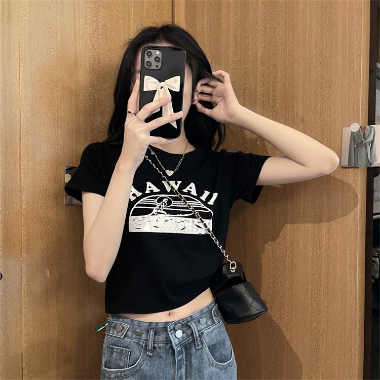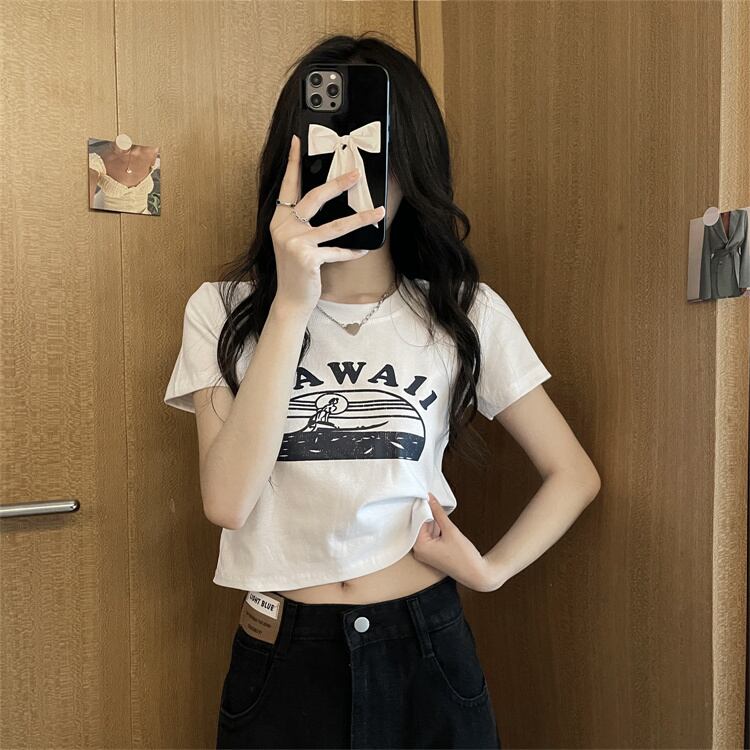 ショートトップス スタンダードプリントグレーTシャツハイウェストウェストNEW レトロ 大人ガーリー スウィート キュート カジュアル ウエスト コーデ Marchs35816022324