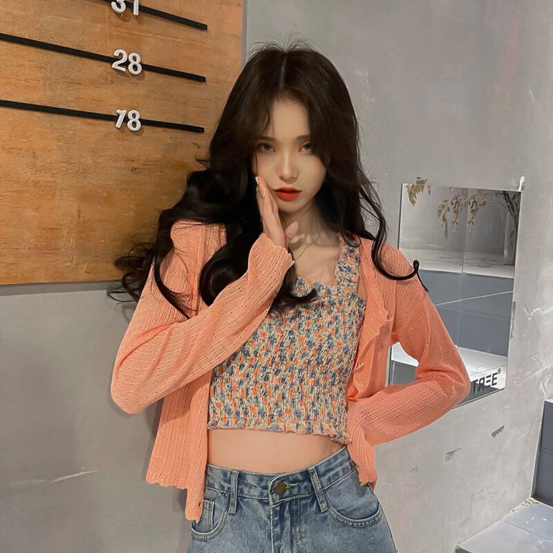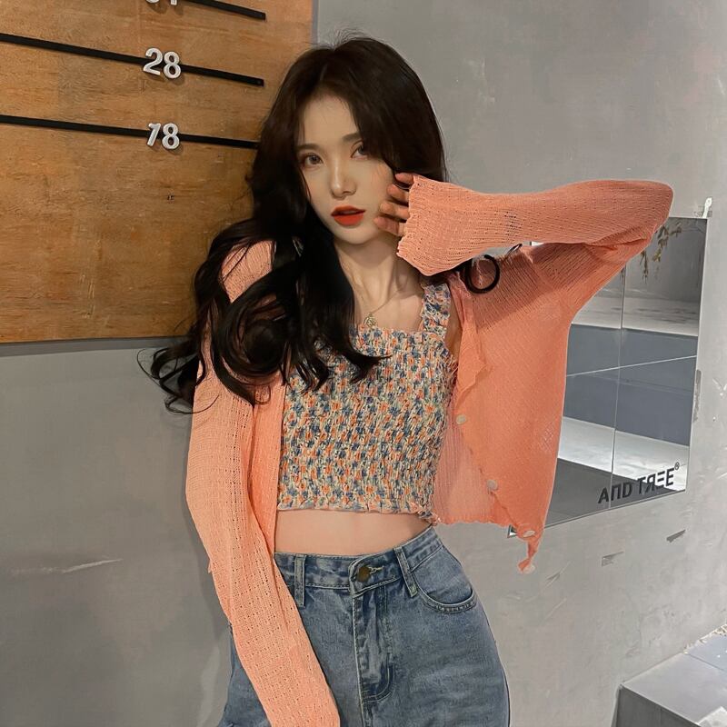 色:オレンジピンクカーディガン,白いカーディガン,ピンクの花柄のベスト,黄色の花柄のベスト