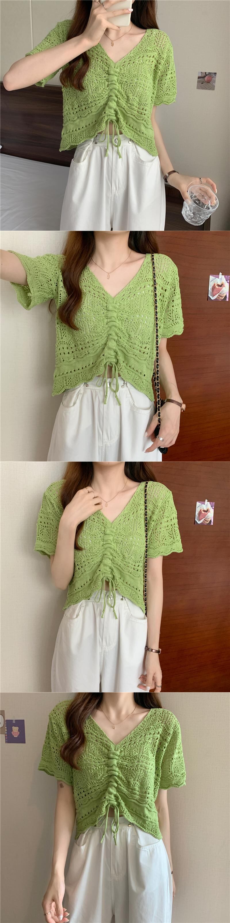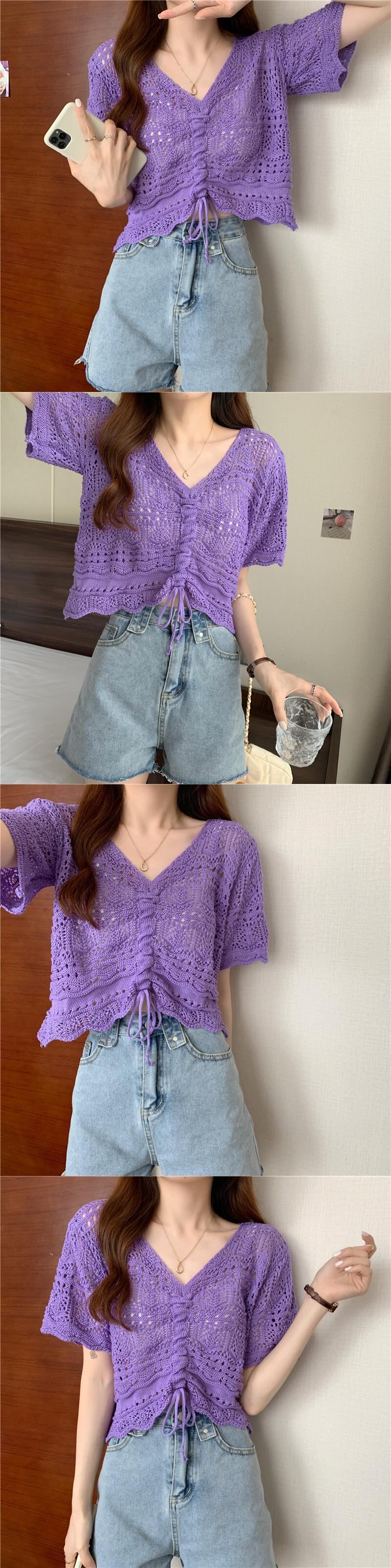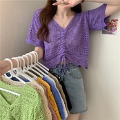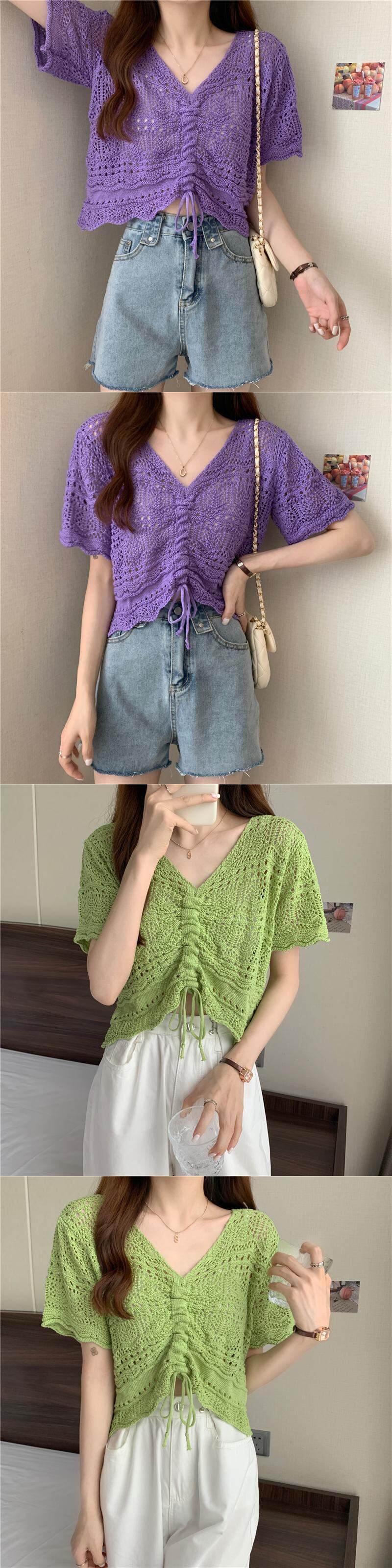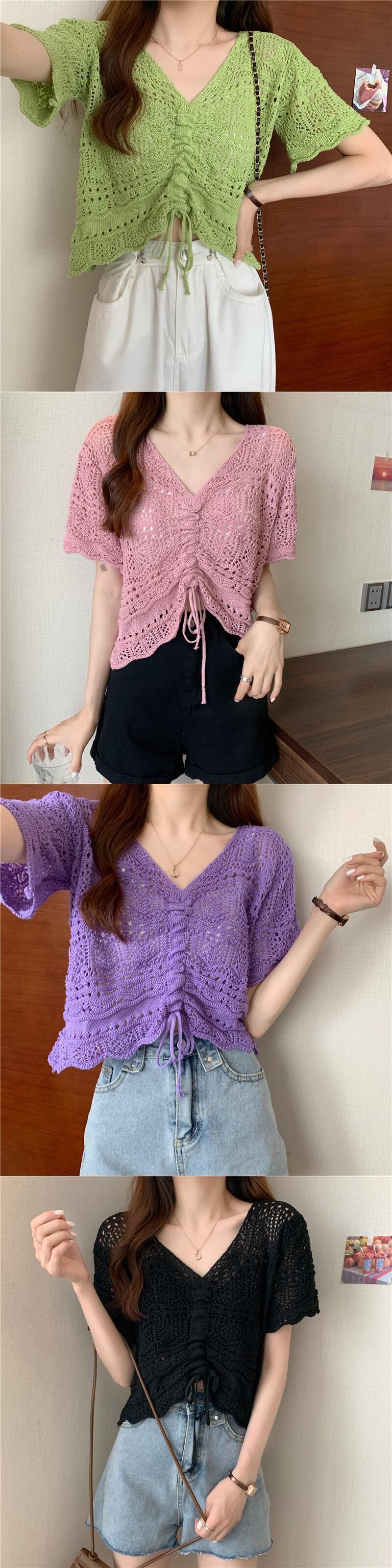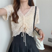 ギャザーショートトップス ハイウェストウェスト半袖スリーブニットブラウス VネックTシャツ夏服 ハーフスリーブ 夏物 シルク ウエスト コーデ Marchs85424387593