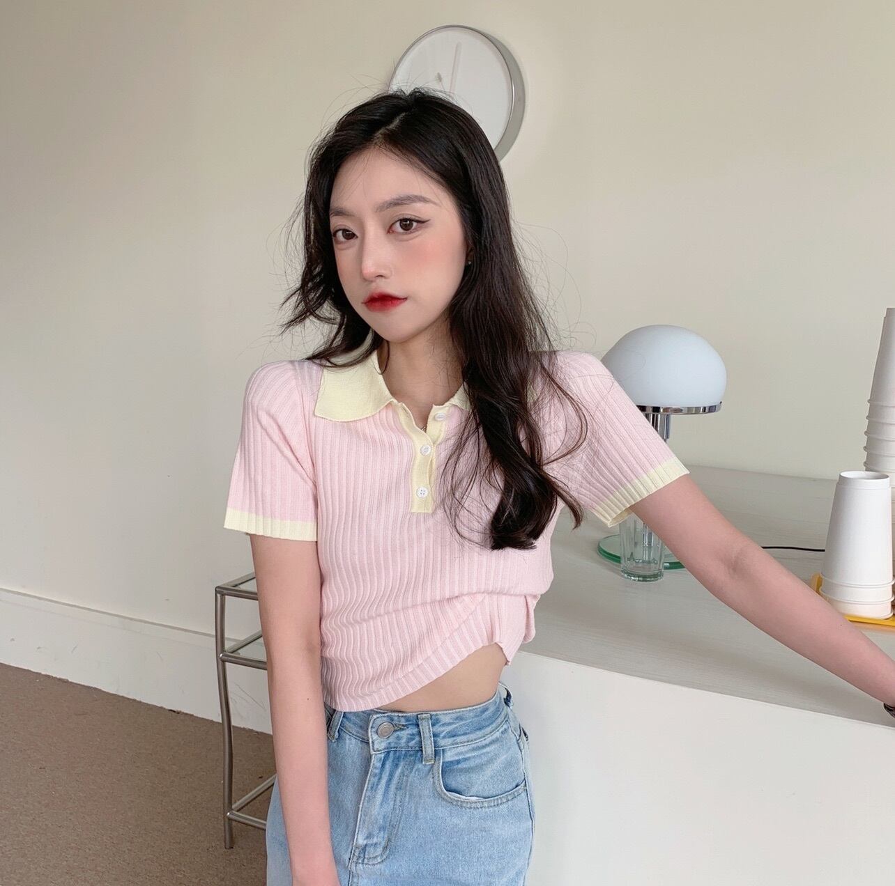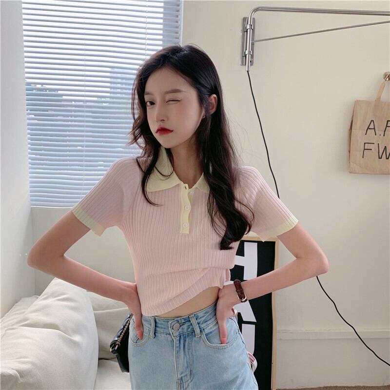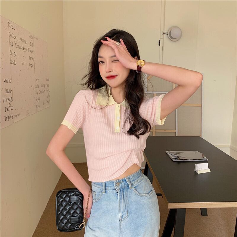 夏服韓国ファッションスリムフィットカラーストライプショートセーター 夏物 スタイル コーデ Marchs27502307172