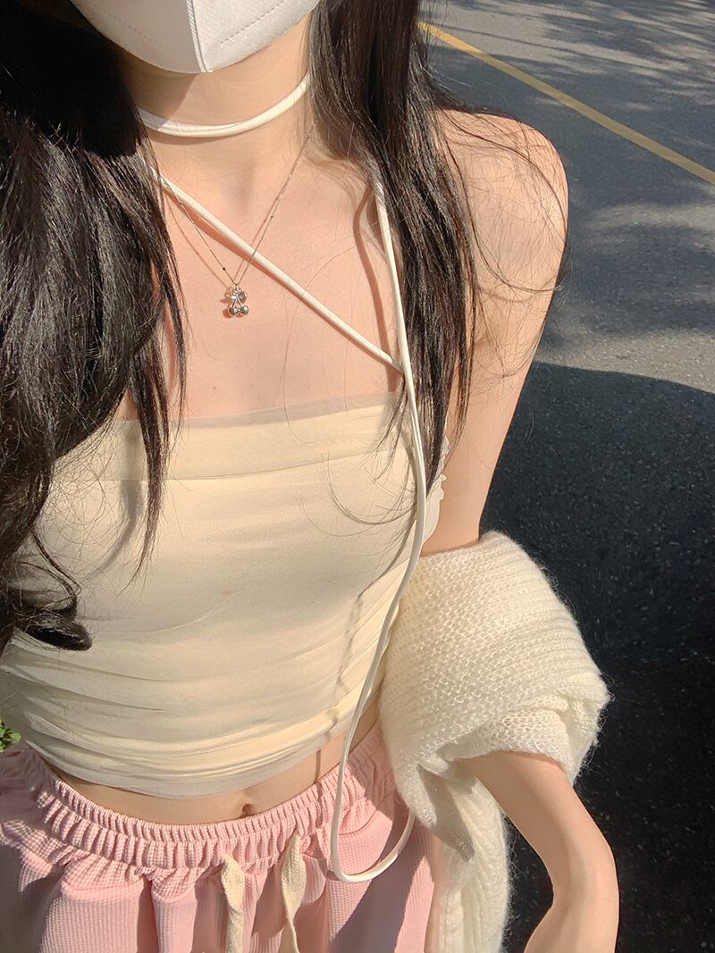 色:ホワイトニットブラウス,ピンクのニットブラウス,ピンクメッシュホルターネックチューブトップ,ネイビーブルーメッシュホルターネックチューブトップ,アプリコットメッシュホルターネックチューブトップ