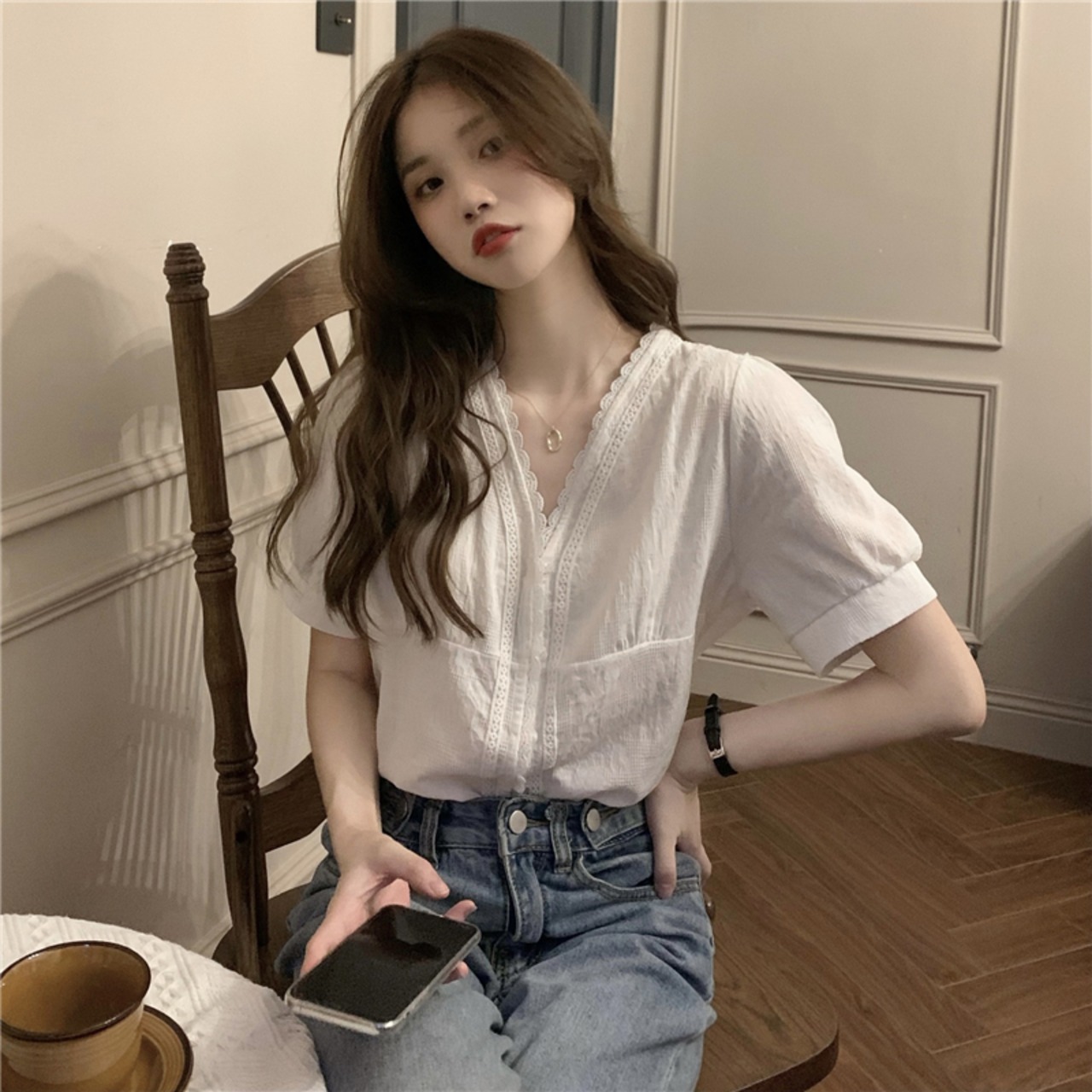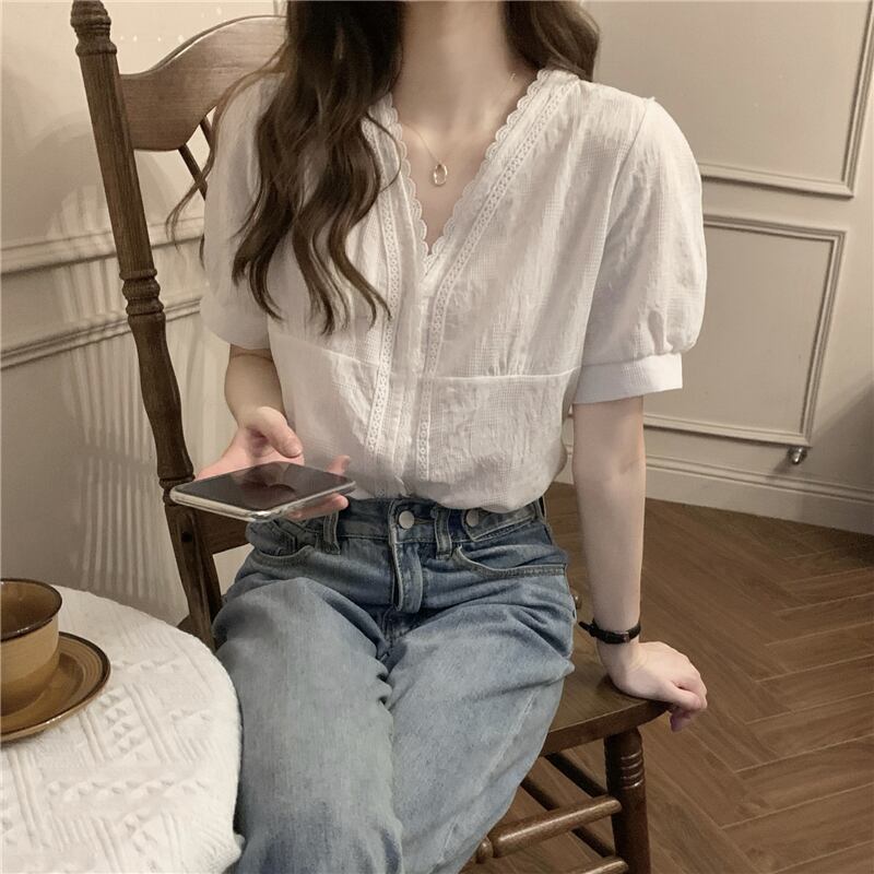 夏服Vネックスリーブシャツ トップス ホワイト 夏物 コーデ Marchs61715089074