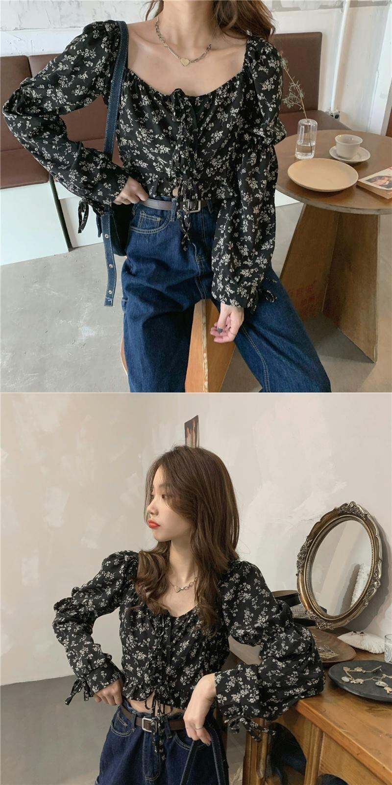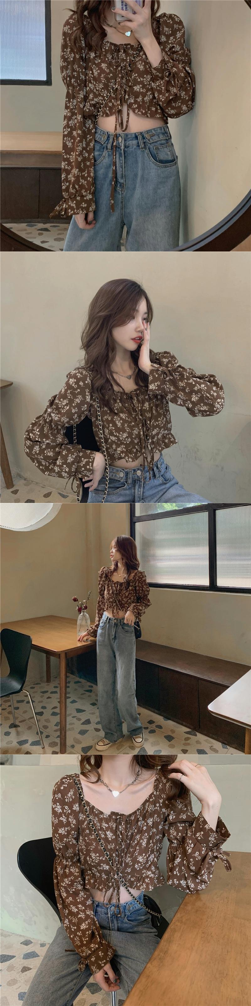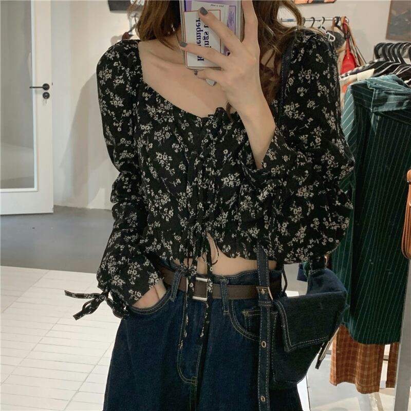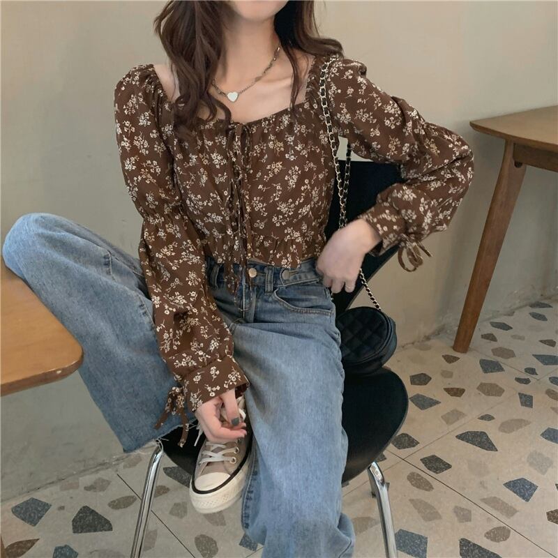 フローラルシャツ スプリング夏服ハイウェストウェストクロップドショートトップス ロング 春物 夏物 花柄 スクウェア 長袖 ウエスト コーデ Marchs98275504397