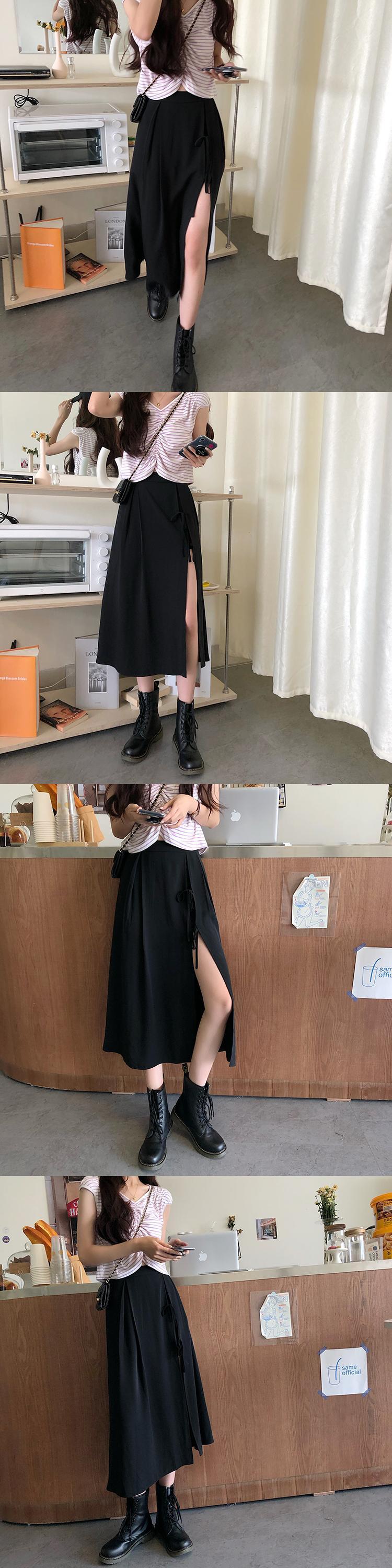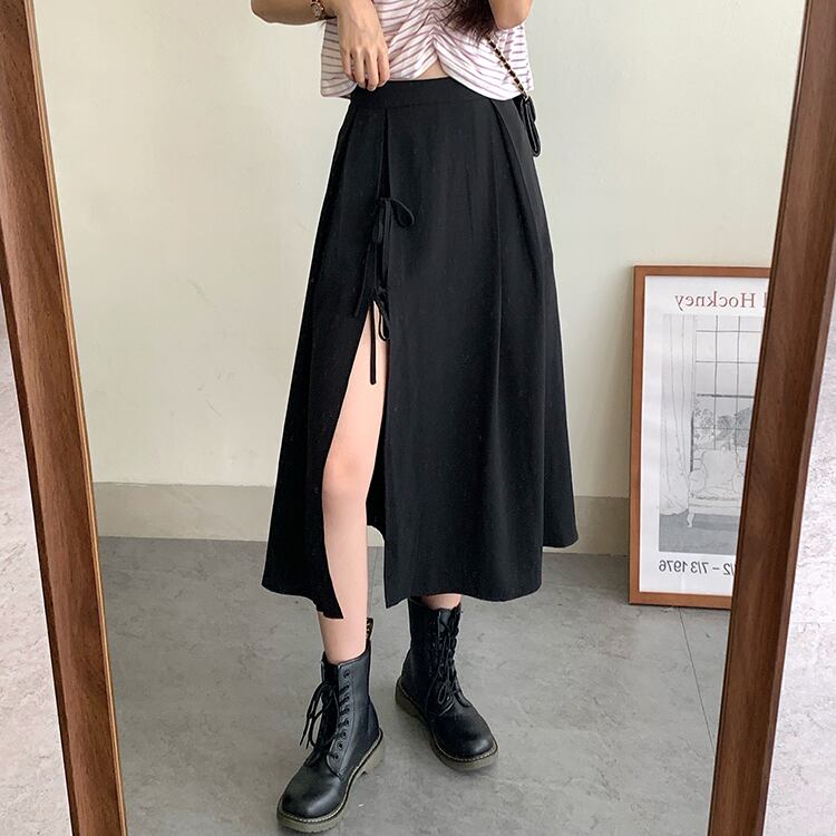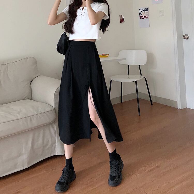 スプリング夏服ブラックAラインスカート スリットハイウェストウェスト ストリート 春物 夏物 ウエスト ミドル丈 コーデ Marchs28374077004