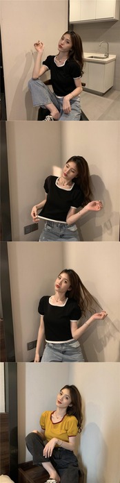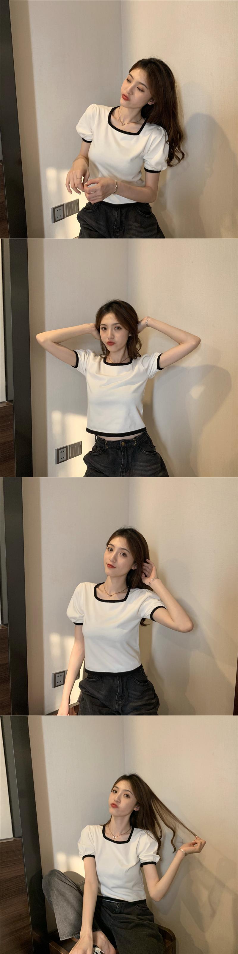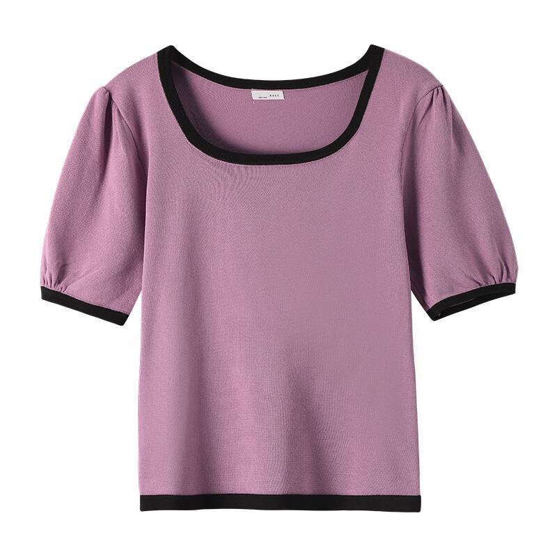 ショートTシャツ夏服スリムニットハイウェストウェストトップス NEW 夏物 パープル パフスリーブ ウエスト コーデ Marchs1468985677