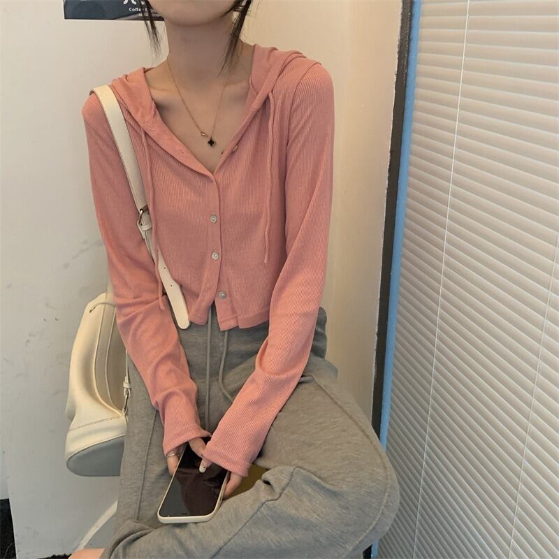 フードセーター カーディガン薄手コート カジュアルシャツ スプリング夏服ショートトップス ピンク 春物 夏物 コーデ Marchs6769707964