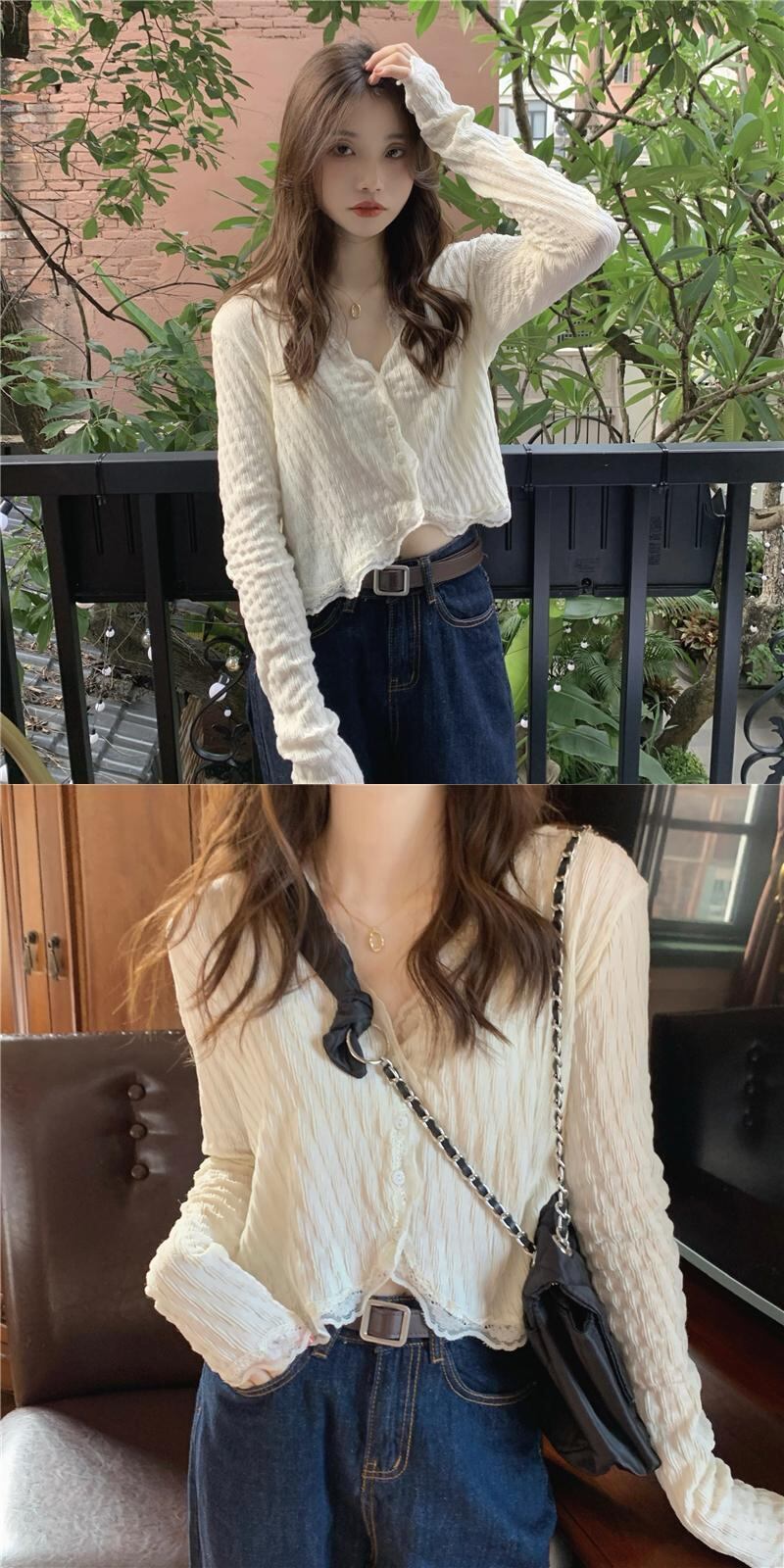 夏服ショートVネックトップス 薄手レースカーディガンシフォンシャツ ロング 大人ガーリー スウィート キュート カジュアル 夏物 長袖 コーデ Marchs96764194028