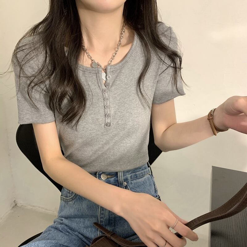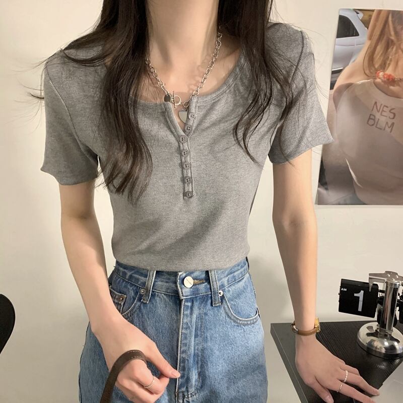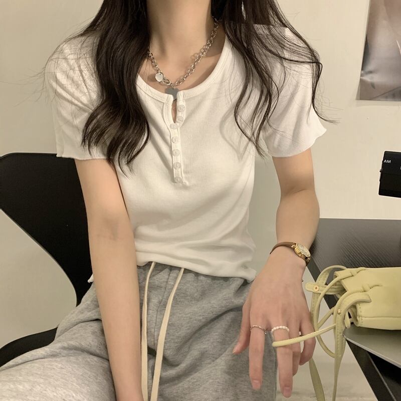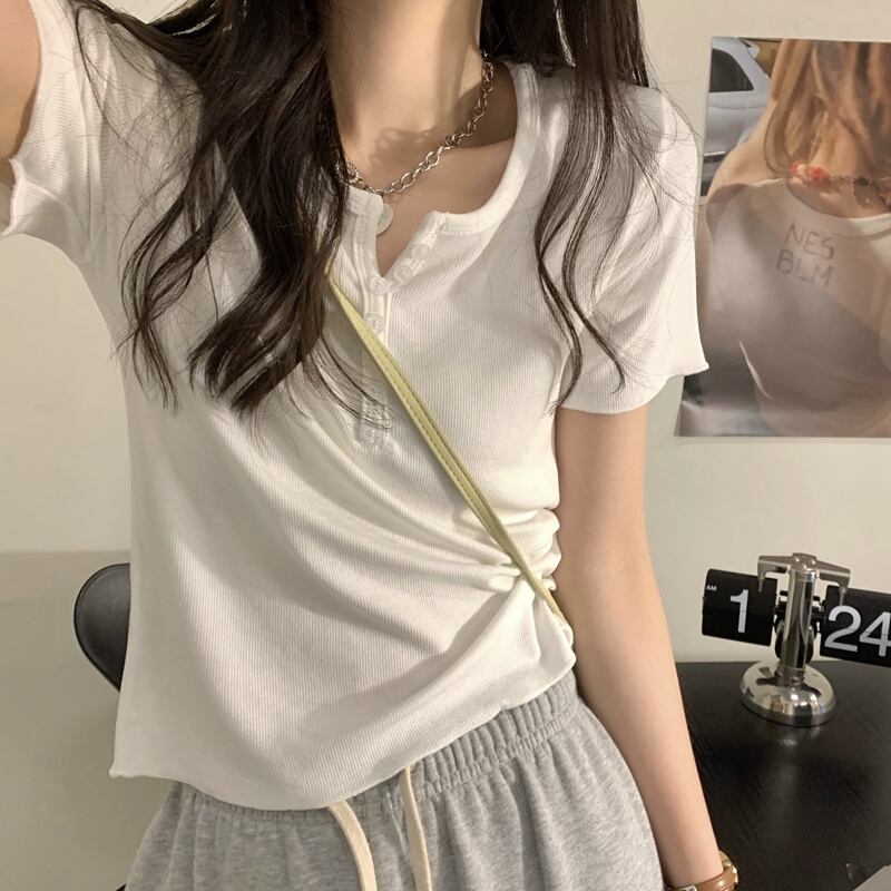 韓国ファッションショートVネックボタンTシャツスプリング夏服ゆったりトップス コットン 春物 夏物 スタイル コーデ Marchs75588297901