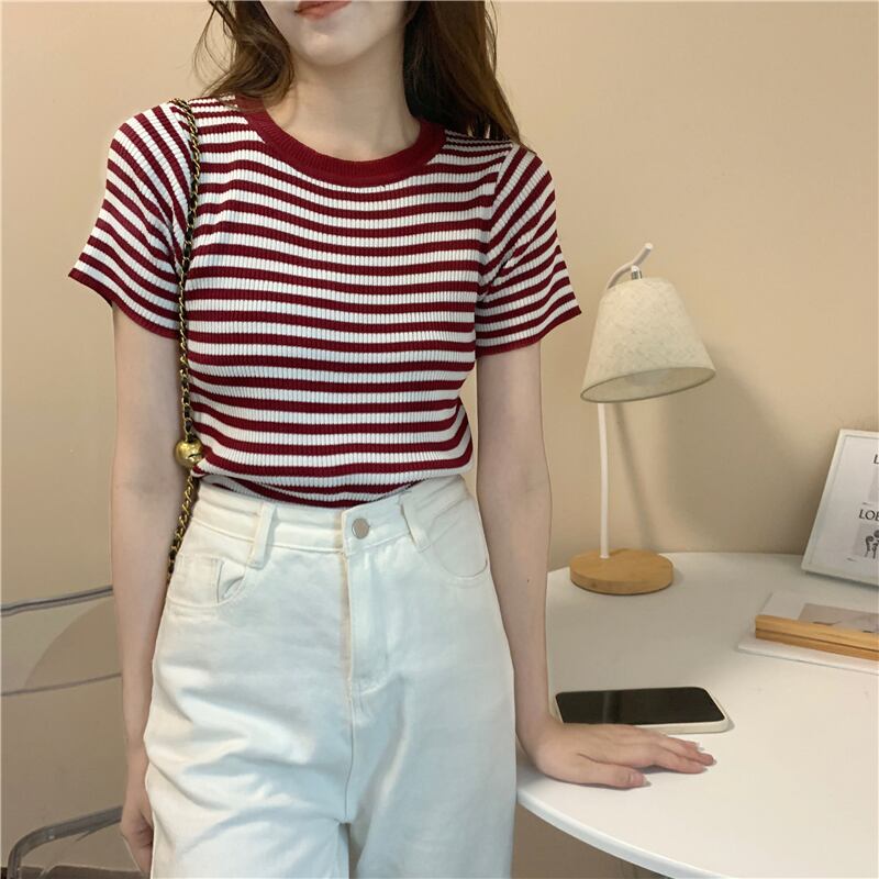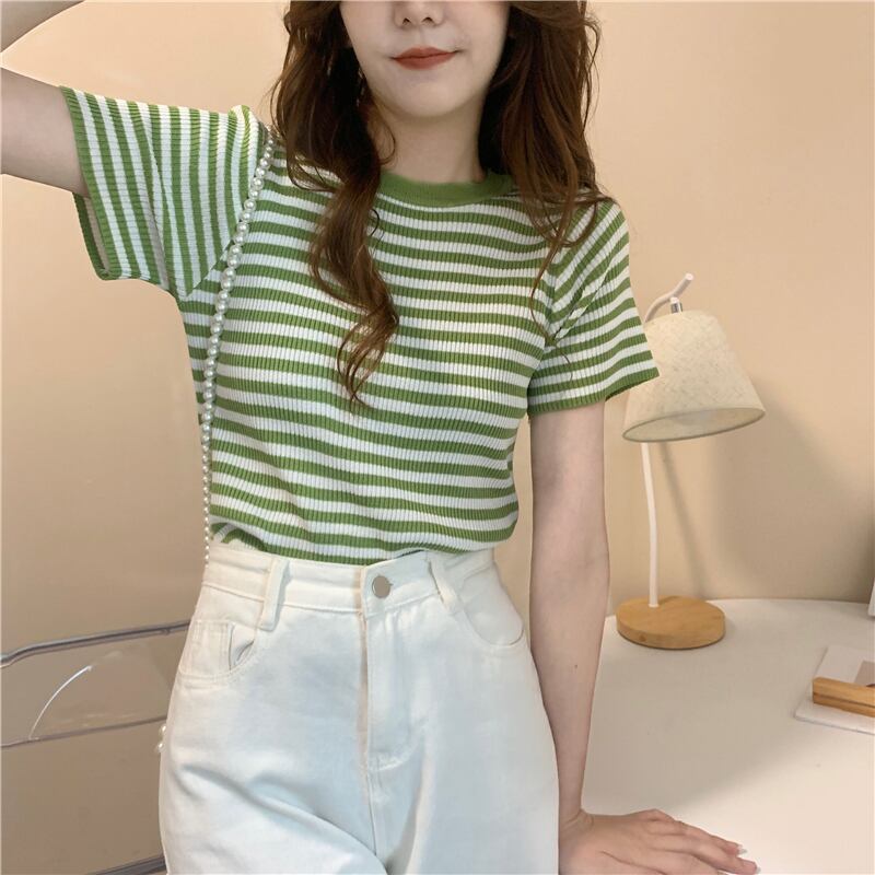 夏服薄手ショートストライプニットセーター 韓国ファッションスタイルハイウェストラウンドネックプルオーバー Tシャツトップス 夏物 Oネック シルク ウエスト コーデ Marchs89486789507