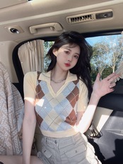 シャツ VネックニットショートTシャツハイウェストウェストトップス 夏服 大人ガーリー スウィート キュート カジュアル 夏物 ウエスト コーデ Marchs17277340395