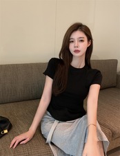 ブラックTシャツショート夏服薄手ラウンドネックスリムソリッド カラートップス 夏物 Oネック ソリッドカラー コーデ Marchs48790597046