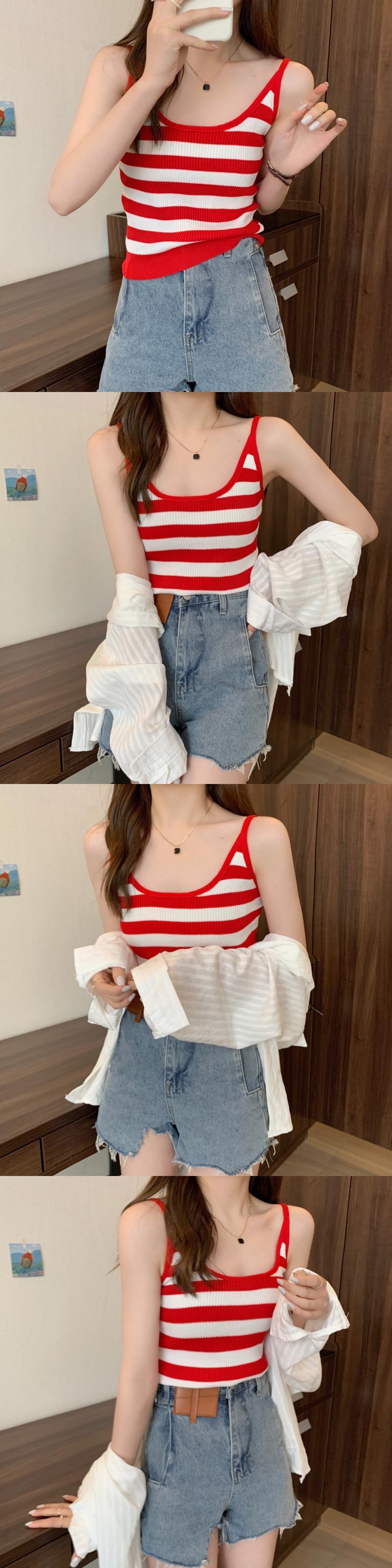 ストライプニット夏服ノースリーブゆったりトップス 夏物 ピュア コーデ Marchs52410800387