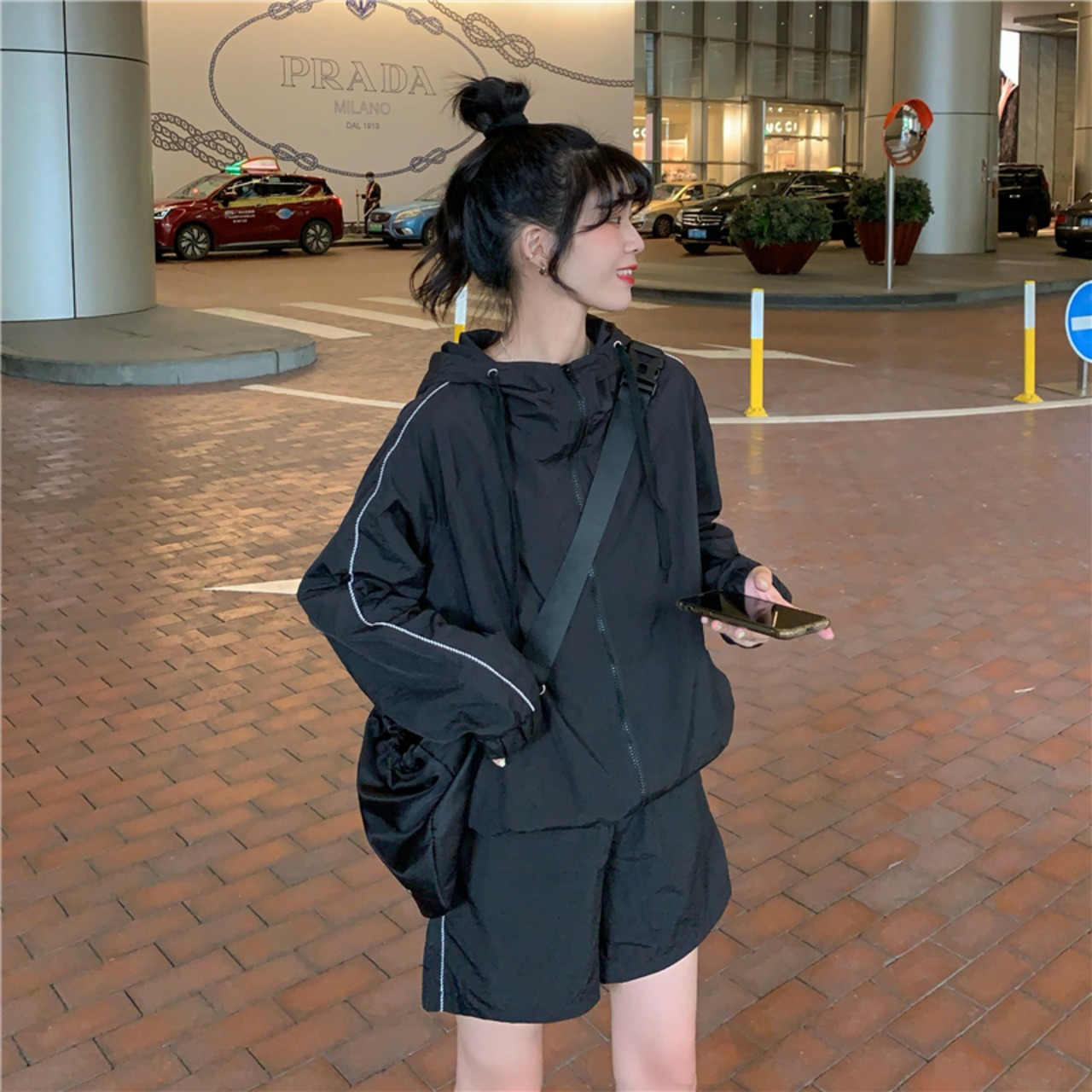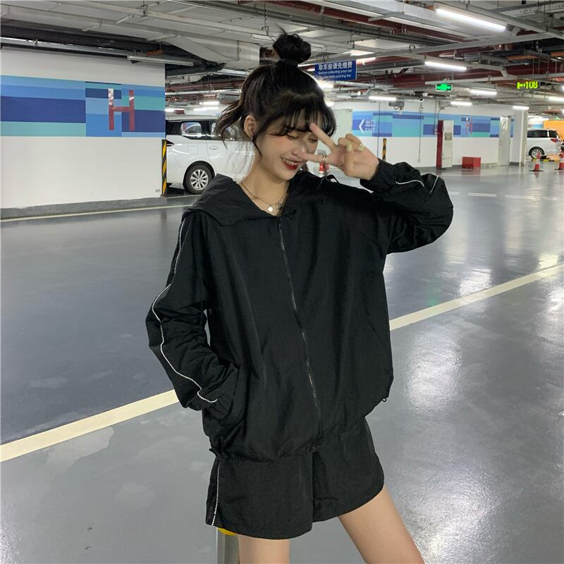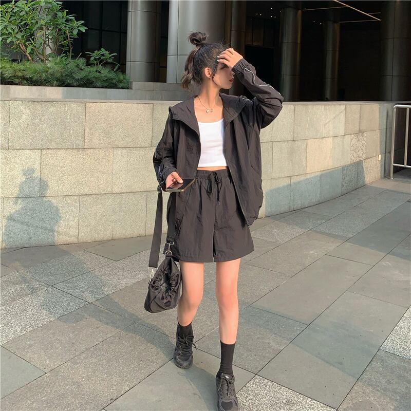 色:ホワイトショーツ,黒のショートパンツ,黒いジャケット,白いコート