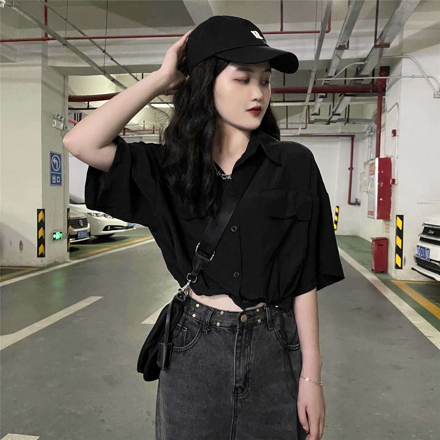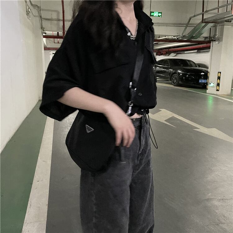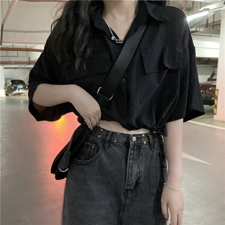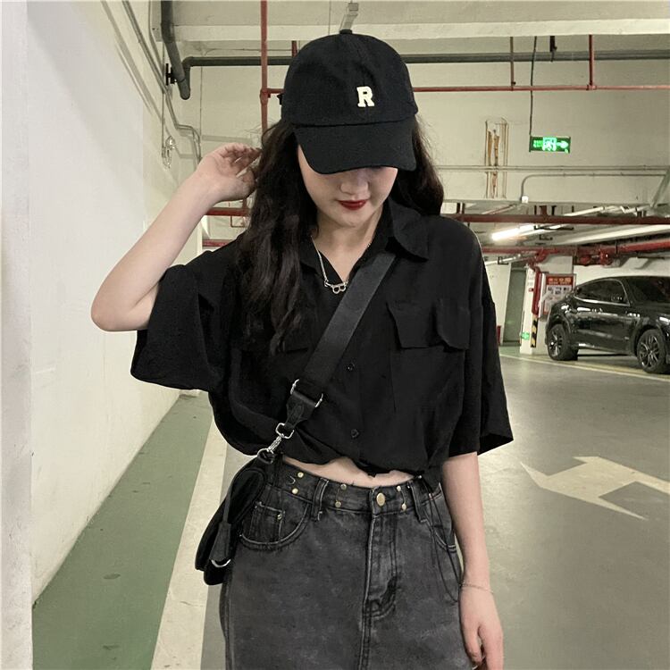ブラックショートシャツ ハイウェストウェストトップス シフォン夏服 夏物 ウエスト コーデ Marchs75633009201
