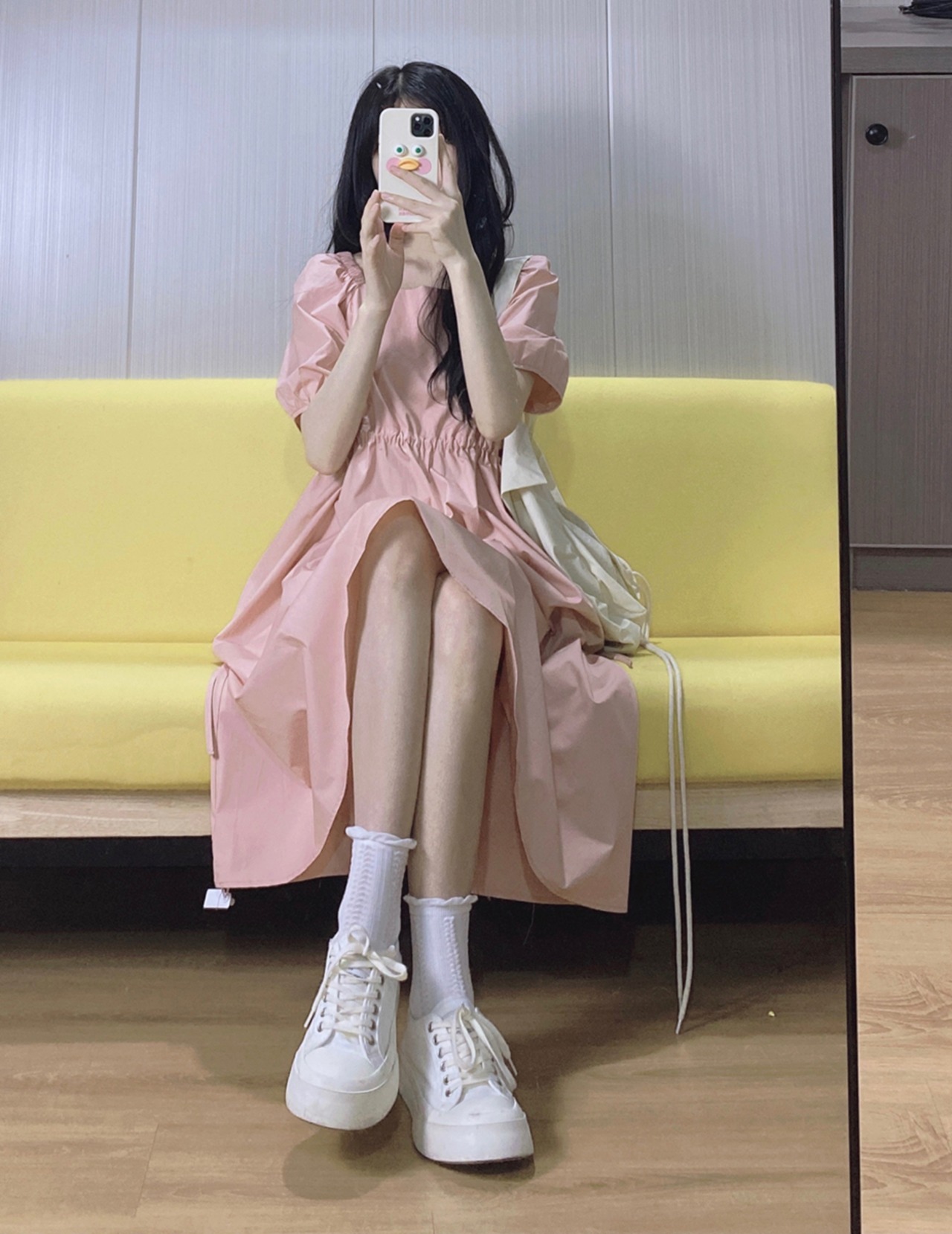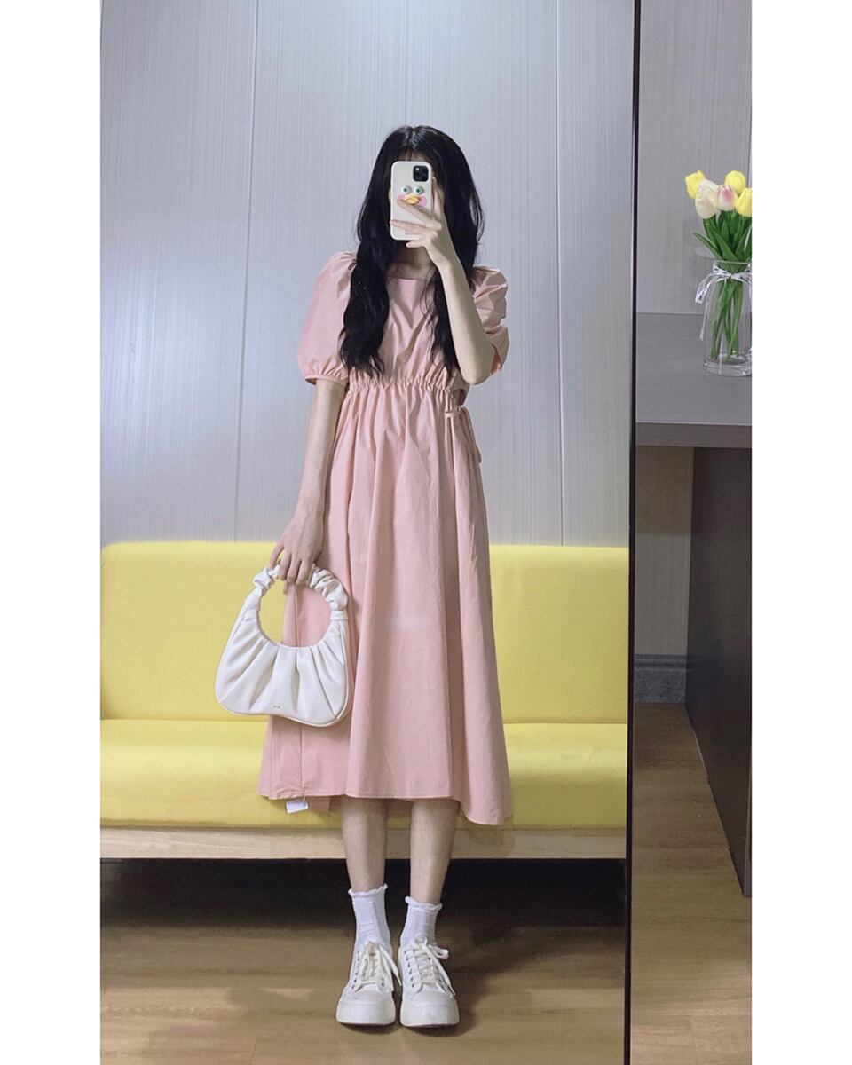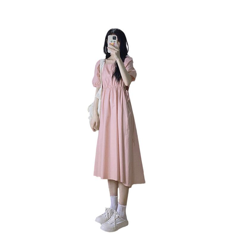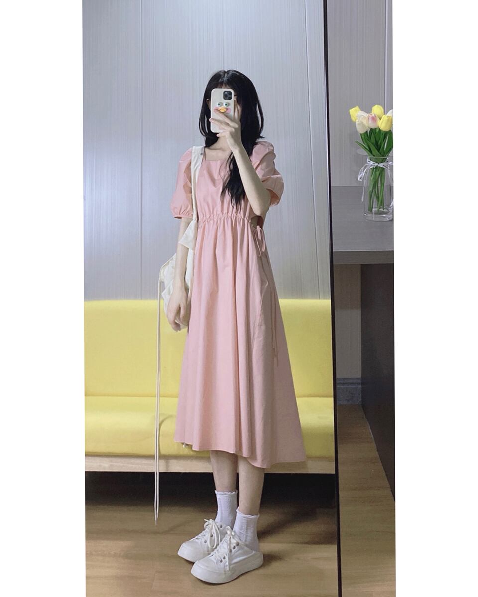 ワンピース夏服ウェストロングスカート ピンク 大人ガーリー スウィート キュート カジュアル 夏物 パフスリーブ ウエスト コーデ Marchs10891073631