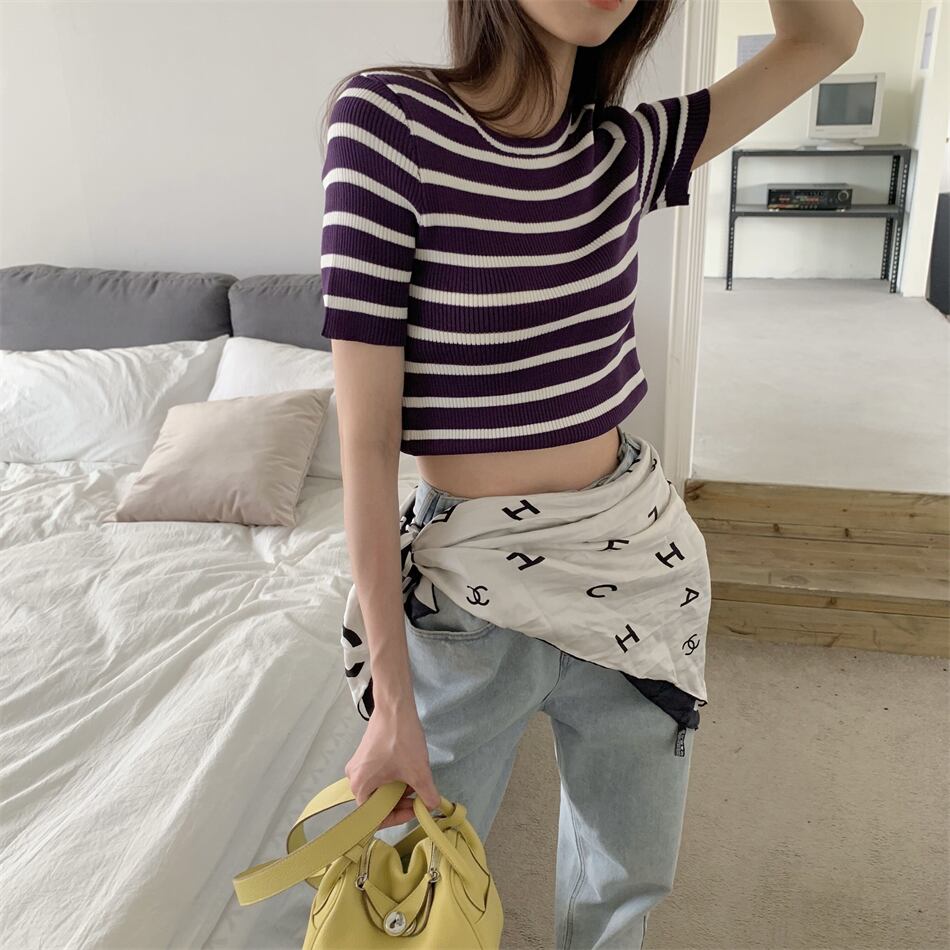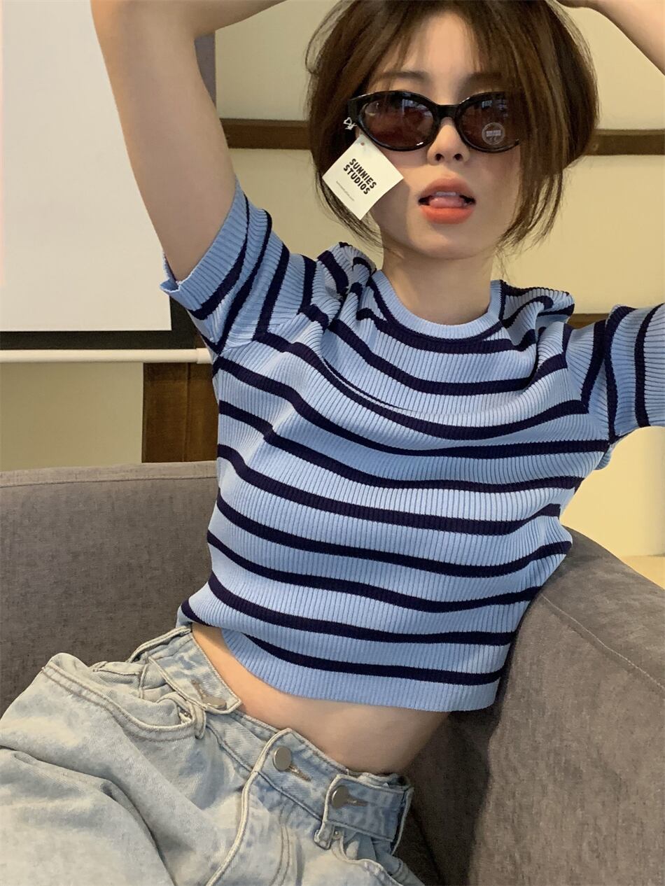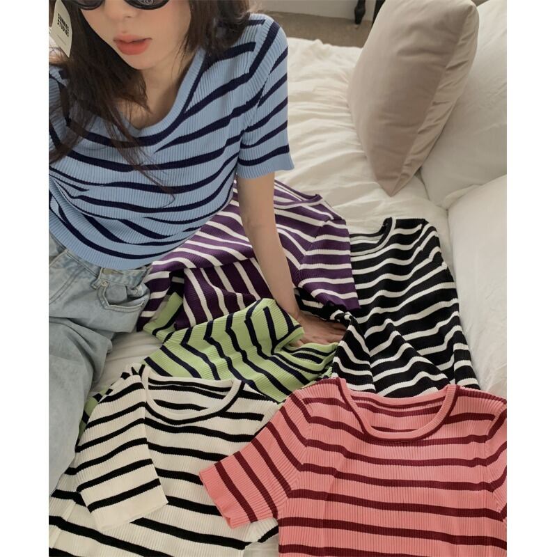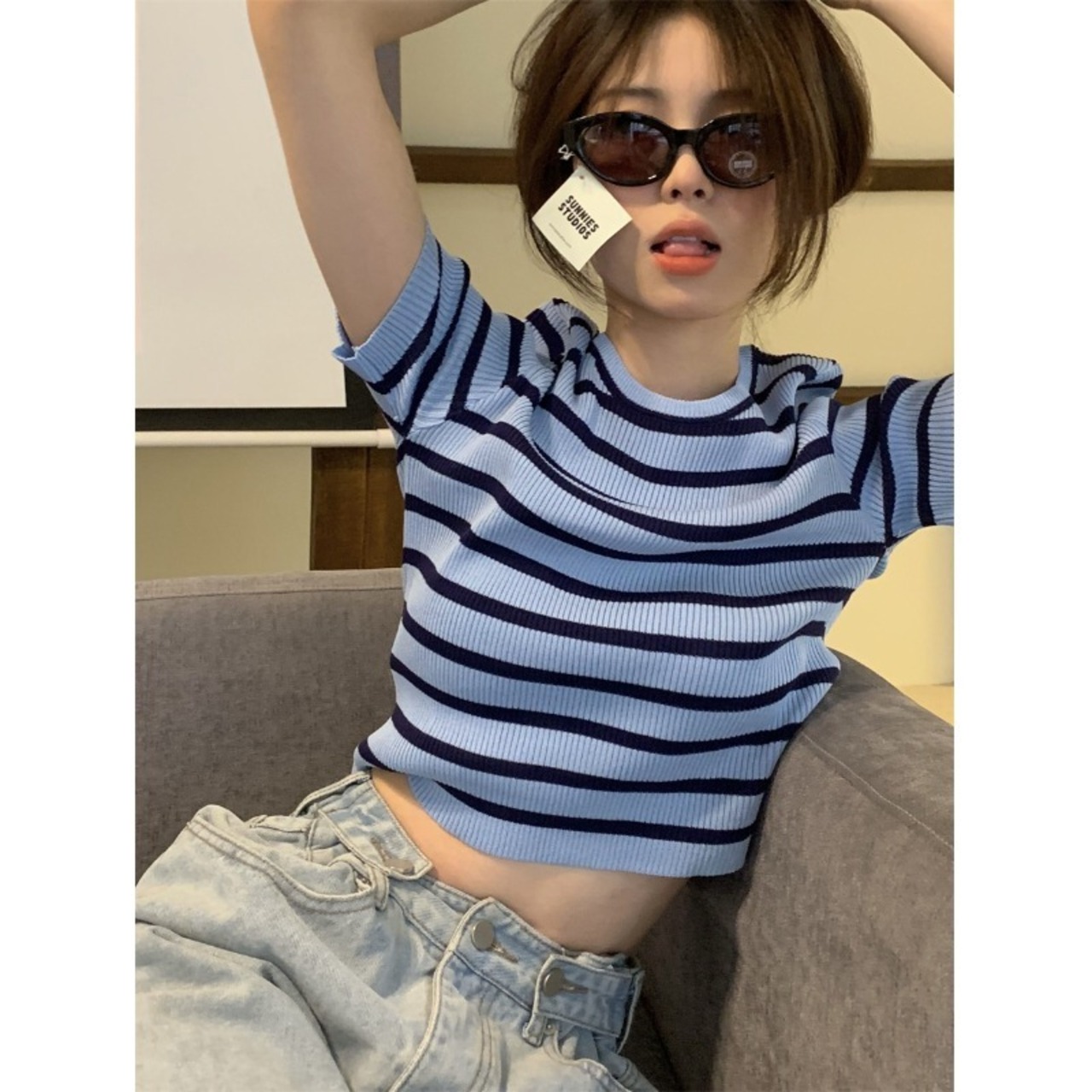 ストライプニットショートTシャツ夏服スタンダードトップス レトロ 夏物 コーデ Marchs66594832009