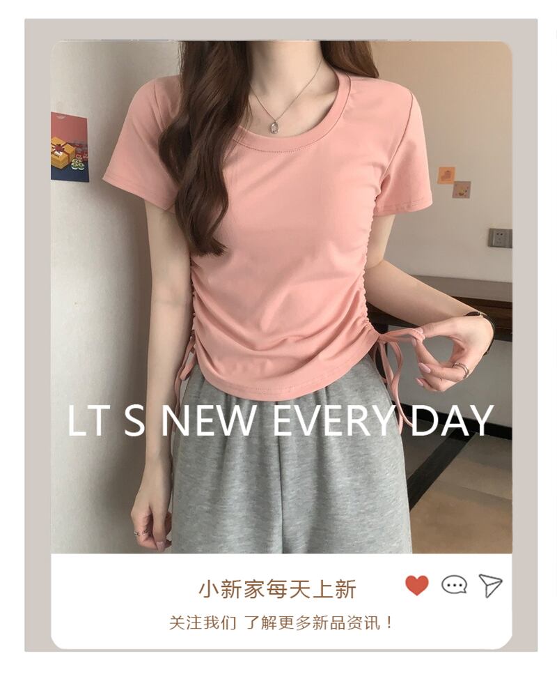 ラウンドネックギャザーショートTシャツ夏服ハイウェストトップス ピンク 夏物 Oネック ウエスト コーデ Marchs88759313518