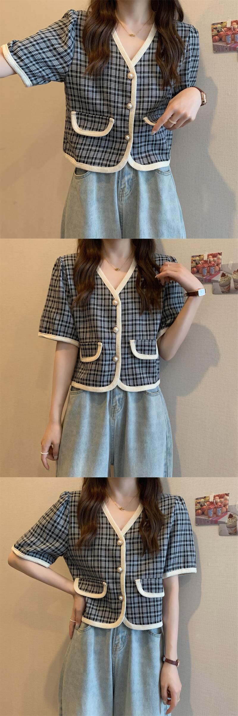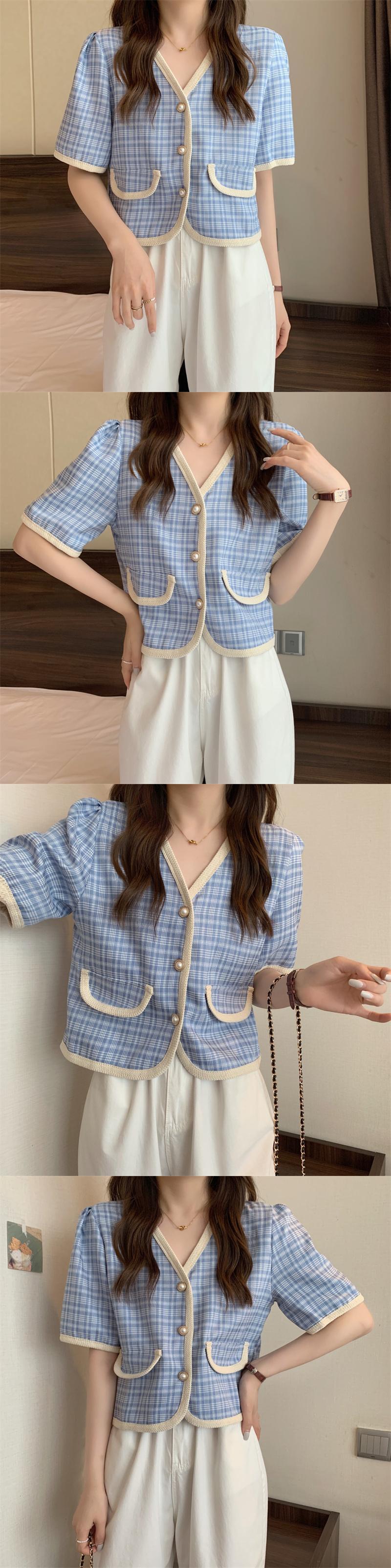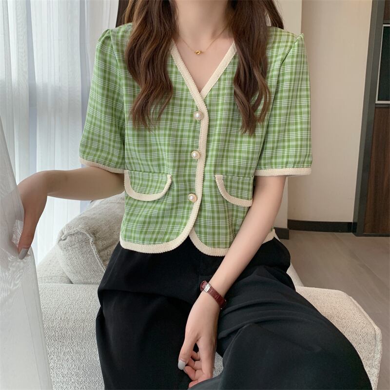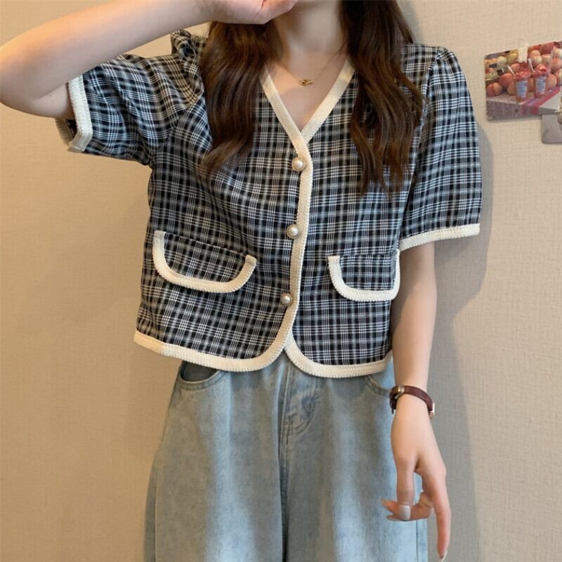 Vネックスタイルスタンダード格子柄シャツ ショート夏服トップス レトロ 夏物 コーデ Marchs46211485197