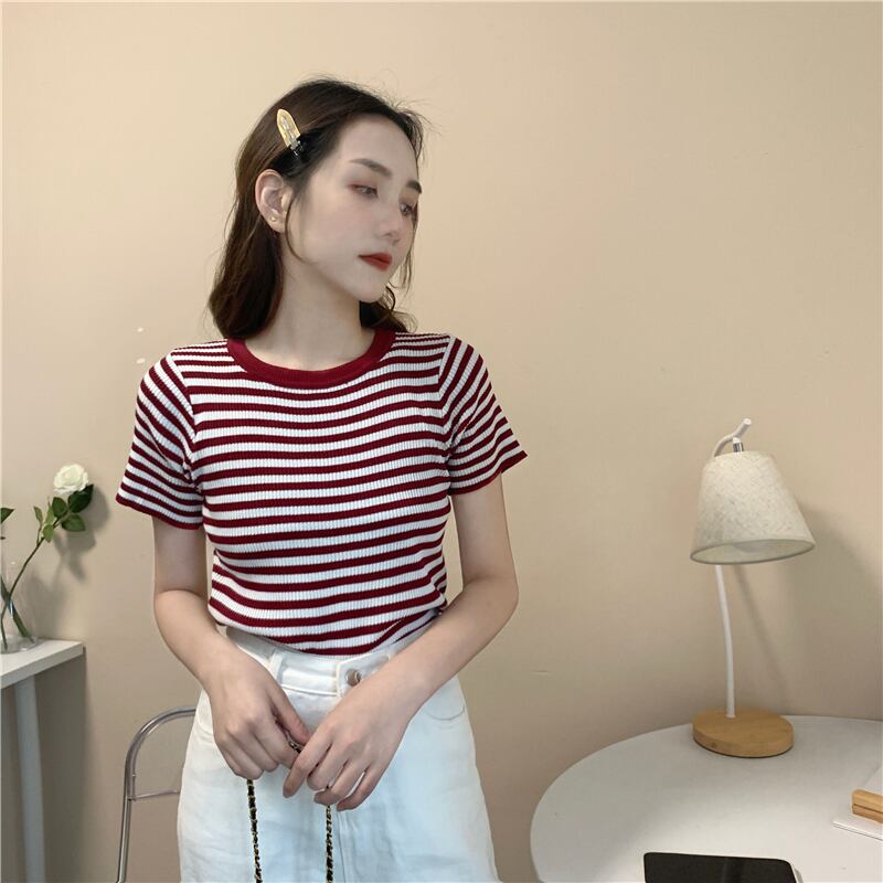 薄手トップス TシャツNEW夏服ゆったりストライプセーター レッド 夏物 シルク コーデ Marchs9870326414