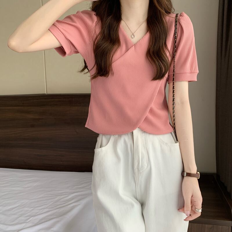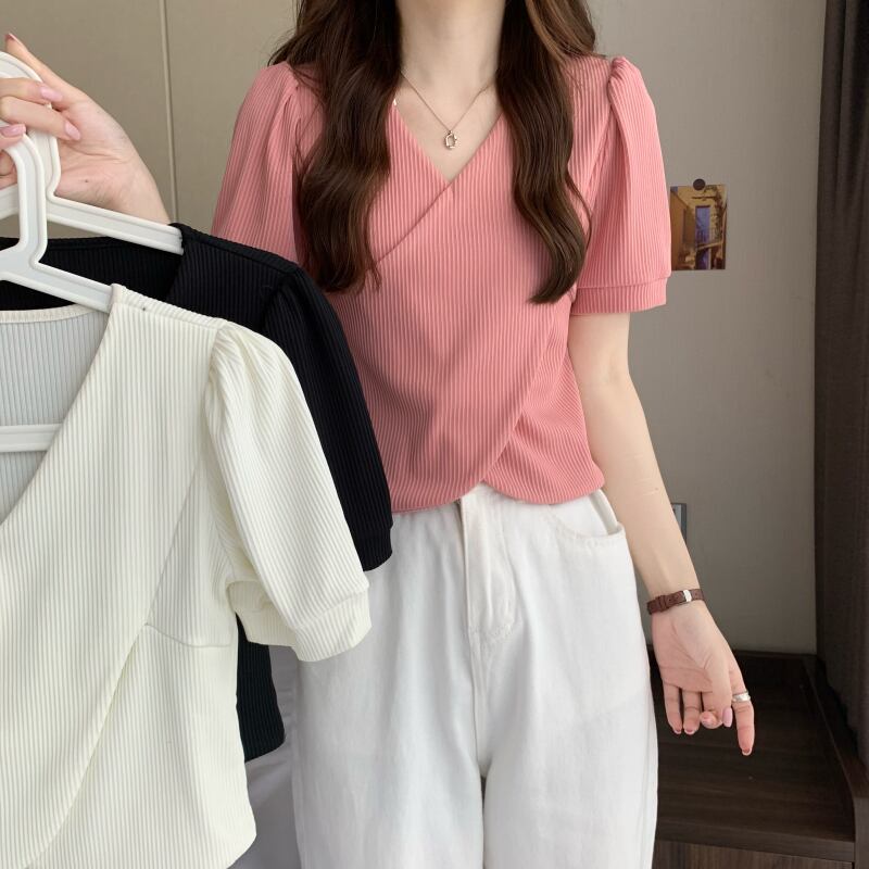 夏服Vネックトップス ホワイトTシャツ 夏物 ピュア パフスリーブ コーデ Marchs69912365224