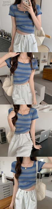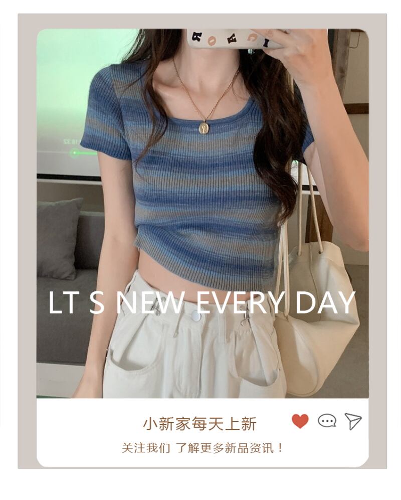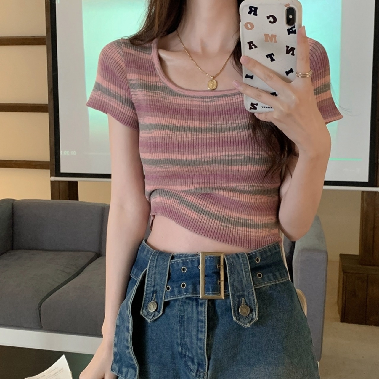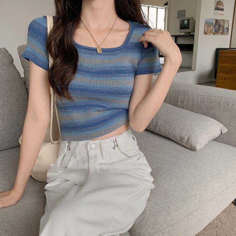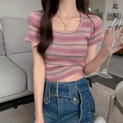ストライプニットショートNEW夏服スタンダードカラーTシャツトップス レトロ 夏物 スクウェア コーデ Marchs13126643267