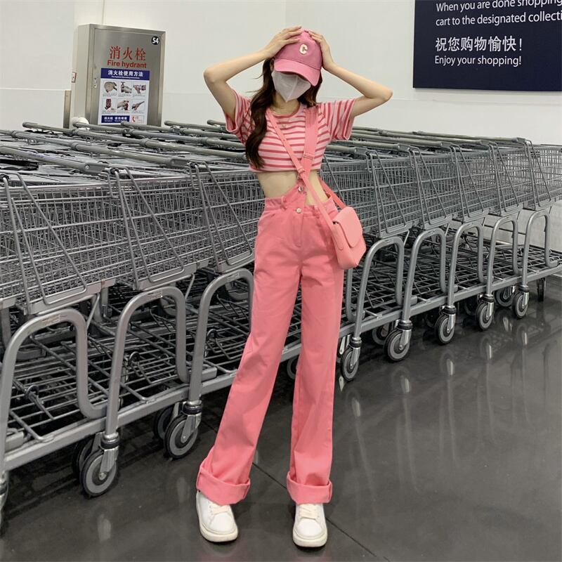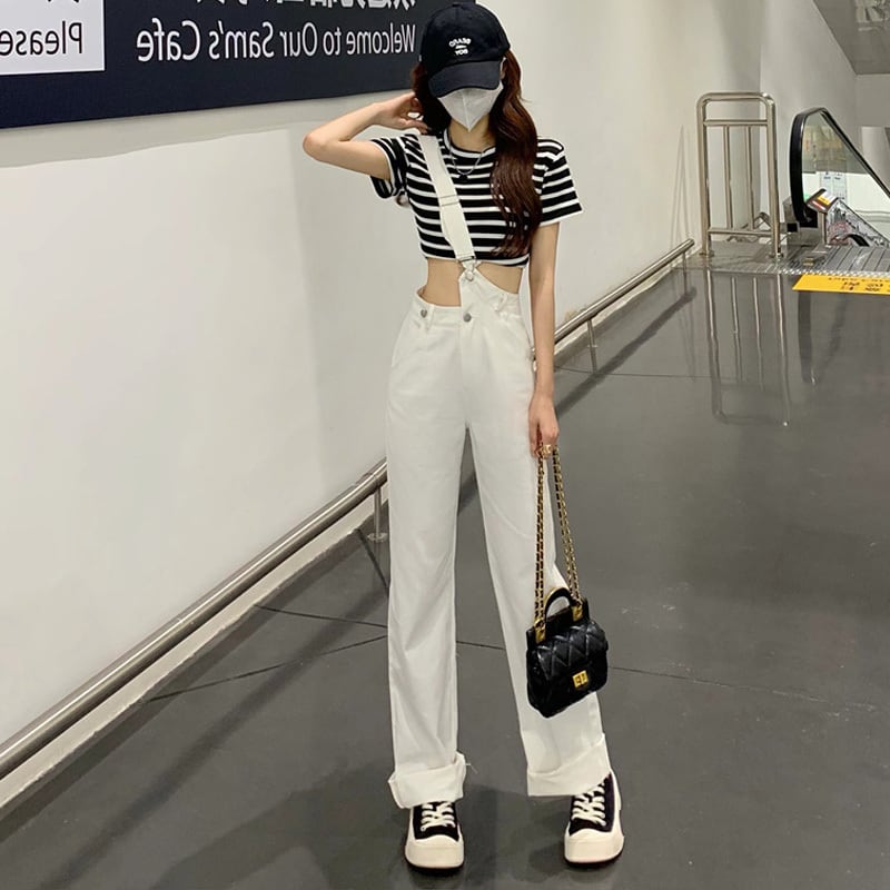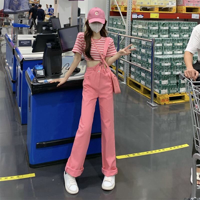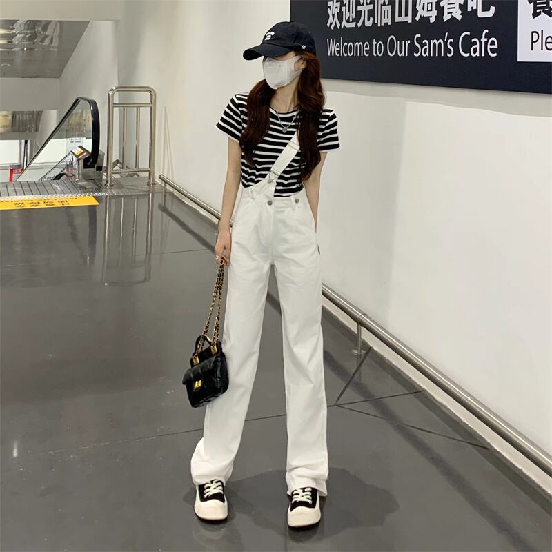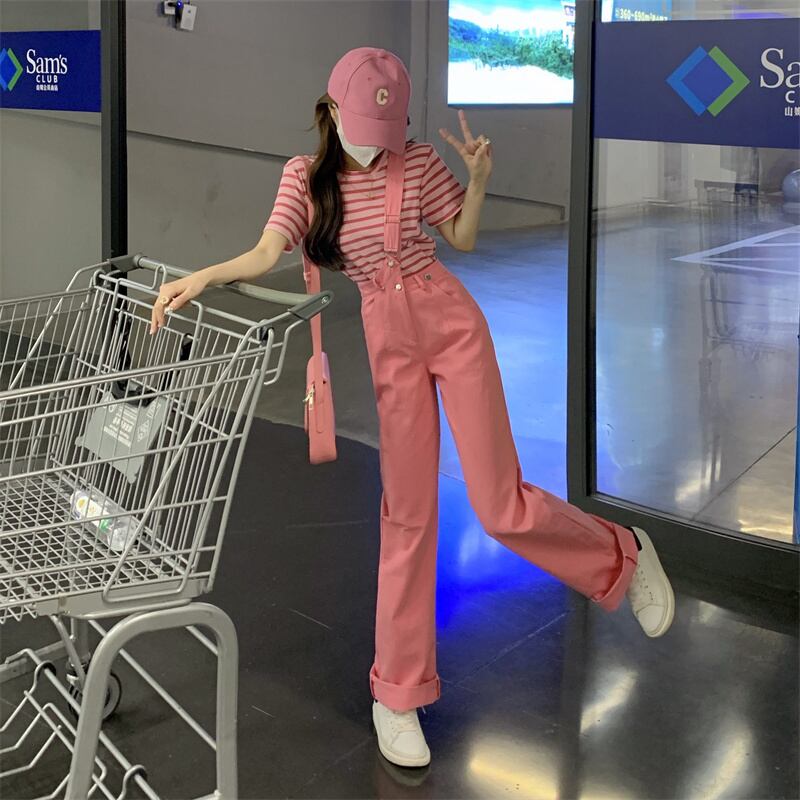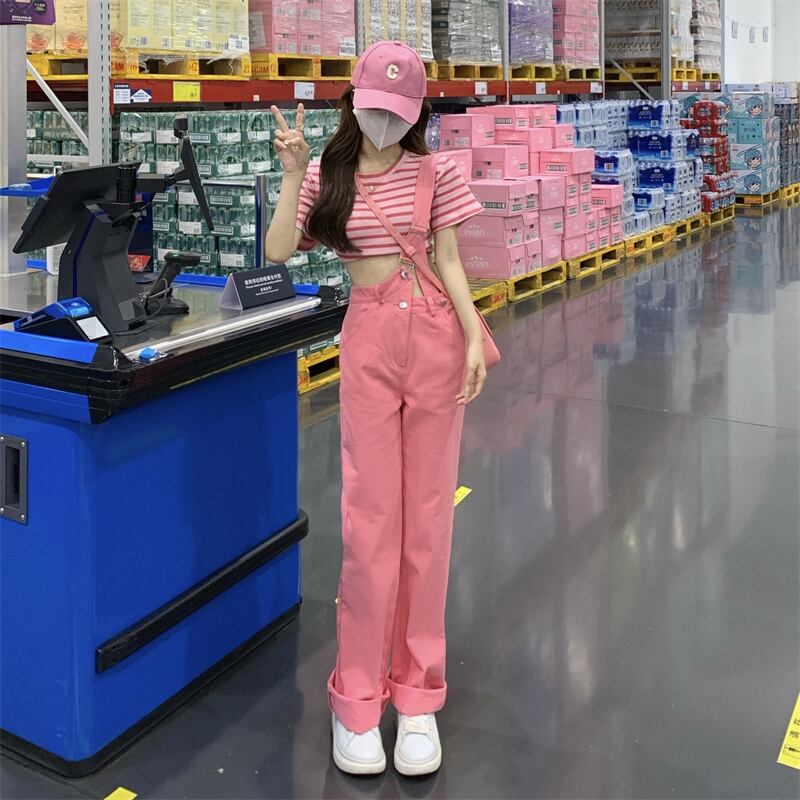 色:白いよだれかけ,ピンクのオーバーオール,黒のストライプt,ピンクのストライプt